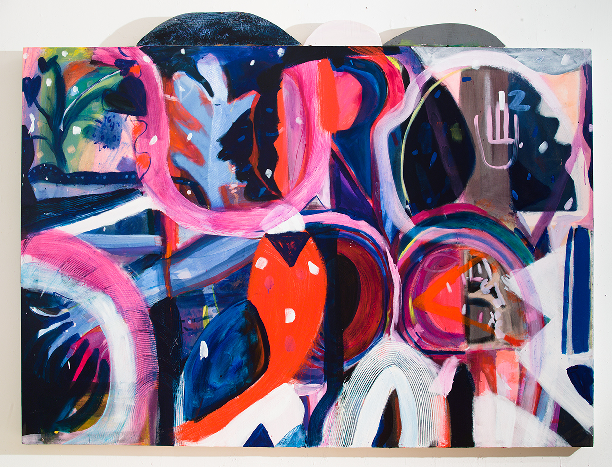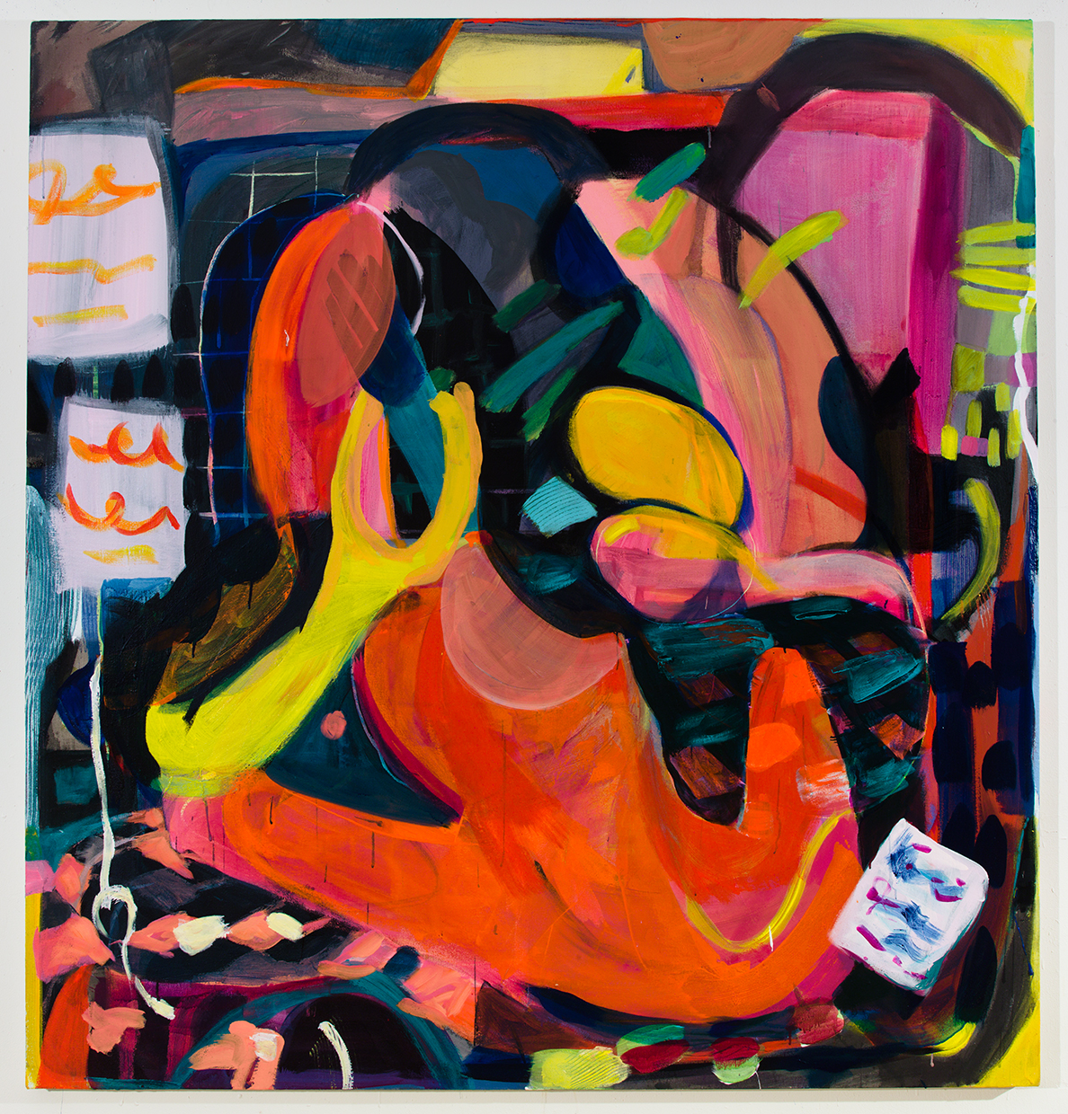 [Image a top: Emily Noelle Lambert, Back in, 2015, acrylic on canvas with wood, 86 x 60 inches.]