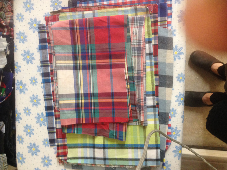 Campbell Thomas’s collection of patterned fabrics and plaids are an important element in her work.