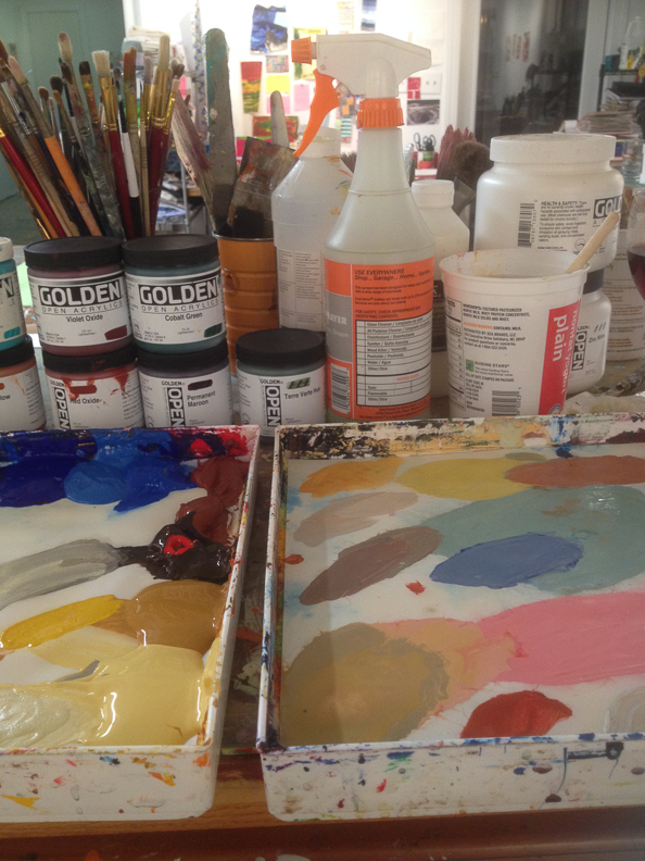 Good idea: Stephan stretches latex gloves over the jars on her palette table to keep turps fumes from escaping and she uses a brick as a brush holder.