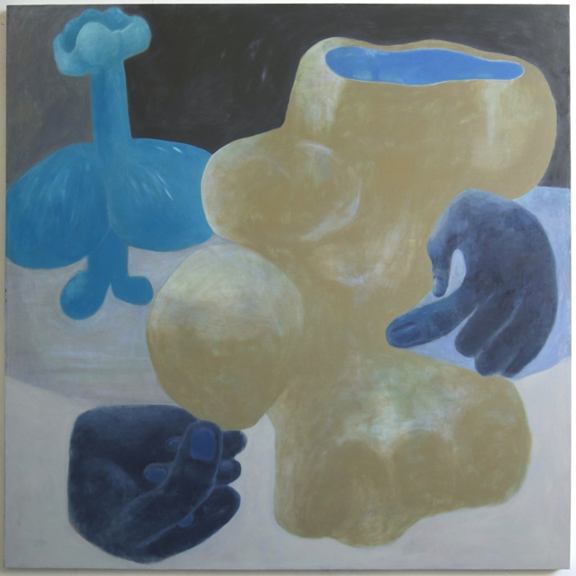 The galleries are teeming with body parts this month. At Stout Projects, Clarity Haynes presents a series of bracing, carefully observed, truncated torsos of older women–the type of nude bodies we rarely see on public display. Less somber ruminations can be found at This Friday or Next Friday where Catherine Haggarty‘s brushy hairstyles, painted with a light touch on diminutive panels, speak to vague memories and everyday experience. In Ginny Casey‘s paintings at 106 Green, on view through Sunday, hands lopped off at the wrist hover over tabletops and interact with vases and pots to tell enigmatic stories of love and longing.