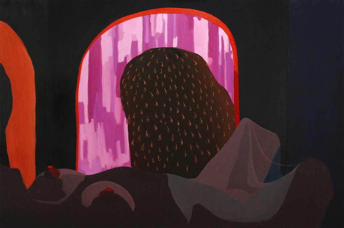 LS: This is one of the last pieces I made before I switched over to shaped canvases [he points to a rectangular canvas]. The shape in the middle is a window. I made a series of paintings based on a room flattening space, create an image that was also an abstraction. I was interested in a few different variables: a back wall, portal — some kind of light phenomenon. This one’s called Creeper. There’s a creepy figure responding to this De Chirico-esque nude, in front a pink digitized military fatigue. The more I made these paintings the more I cared about the recurring window shape, and I just decided to make a shaped canvas based on it. I made several in that rounded portal shape.