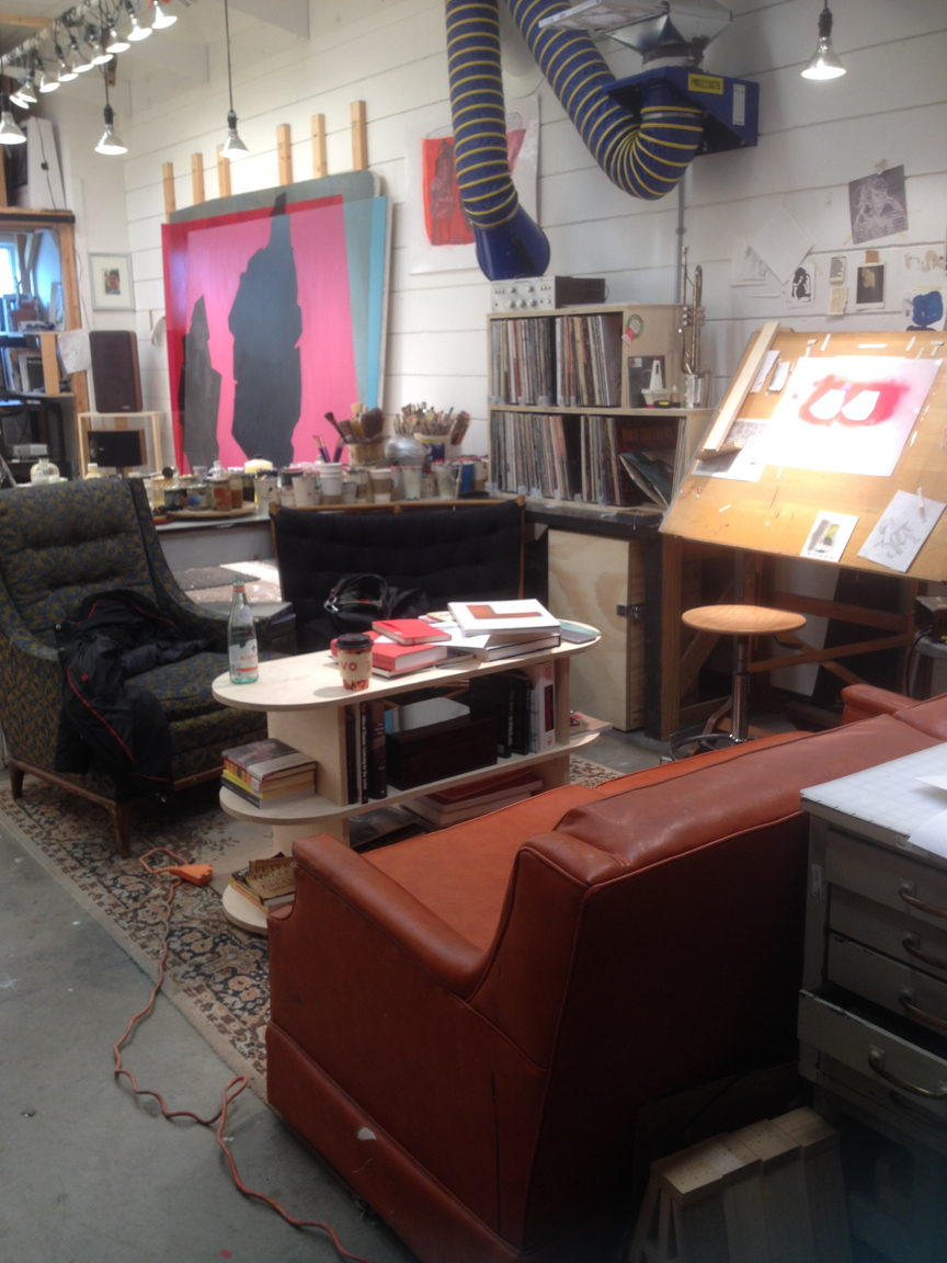Contributed by Sharon Butler / I took a trip to Madison, Wisconsin, in December, when the sky was gray but before the temperature had turned bitter. My guide was Leslie Smith III, a 2009 Yale MFA graduate with a BFA from the Maryland Institute College of Art who will have paintings on display at VOLTA next week with beta pictoris gallery / Maus Contemporary. Smith is an assistant professor of drawing and painting at University of Wisconsin-Madison, where he has a generous studio in the art building on campus. During my visit, he showed me his new paintings, which are purely abstract, comprising multi-panel shaped canvases, vivid, high-key color, and wobbly geometric shapes. We talked about the painting process, his shift to shaped canvases, and his transition from figurative work to abstraction.