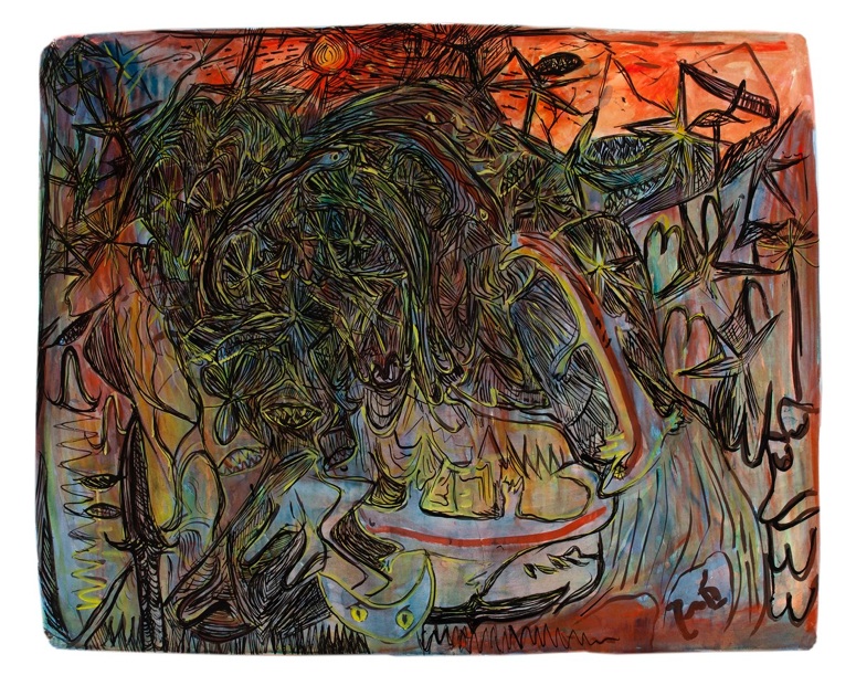 A native of Washington state, Peter earned a BFA at the California College of the Arts in San Francisco. He returned to Washington in 2005 and settled in Bellingham. Surrounded by the lush northwest environment of his childhood, he has made increasingly complex paintings that combine the nature-gone-wild flavor of Henri Rousseau’s jungle scenes with the cheeky verve of the Chicago Imagists and the Surrealist automatism of painters like Andre Masson and Joan Miro. He builds his paintings in layers, using disparate approaches interactively. For instance, traditional romantic landscape painting techniques might find themselves intertwined with a 1990s grunge poster/stoner drawing sensibility. In Peter’s hands, this kind of eclecticism is galvanizing.
