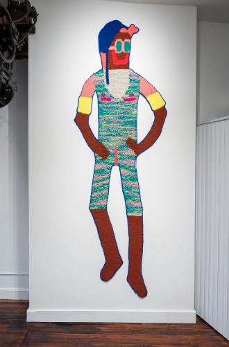 In this auditory city, Chandler�s work rings out that trans* and gender non-conforming bodies are normal. I am struck by the overwhelming feeling of celebration. What does it mean to celebrate a queer body in a homonormative art world? What does it mean to present smiling faces with top surgery scars? Through the presence of these crocheted scars the motif of presence and absence arises. These bois used to have breasts, now they don�t. This gallery wall used to be just a wall now it becomes a site for the dispersion of these bois genitalia. I am struck by the uncanny presence of Chandler�s work and I am called to question any assumptions that I may make about the artists mythology. What do I actually know? And what am I bringing to my read of this work? Do their genitals become the wall? Do these figures live in the white gallery wall and their rainbow bright power has allowed for them to swim, heads and legs above through that passage perfect freestyle socked feet stroke?