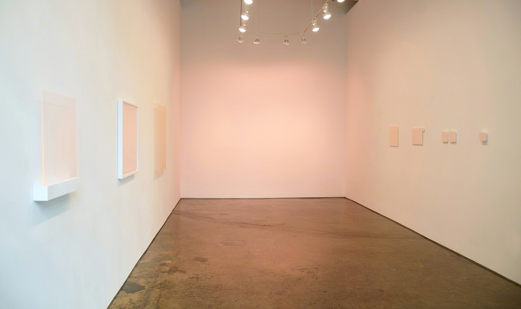 Lynne Harlow‘s elegant and evocative show at Minus Space is a meditation on the inextricable relationship between color and light. In the ten works on display, Harlow explores pale pink. This is not the generic pastel pink of children’s toys and baby onesies, but rather the specific color that painter Lyonel Feininger created for architect Walter Gropius to mimic the effect of reflected light at dusk.