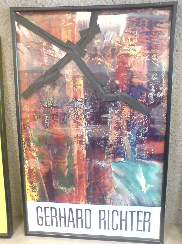Wise ass-brilliant artist Greg Allen declares as a “piece” a commercially produced Richter print, framed with broken glass and held together with black tape, that he saw at the Hirshhorn a few years ago. But he wonders where it is. The framed print is of the 1986 painting A B Dunkel, or Abstraktes Bild Dunkel (Dark), (CR: 613-2). Allen must have taken the image above when he saw it at the Hirshhorn in 2010…? Read more.