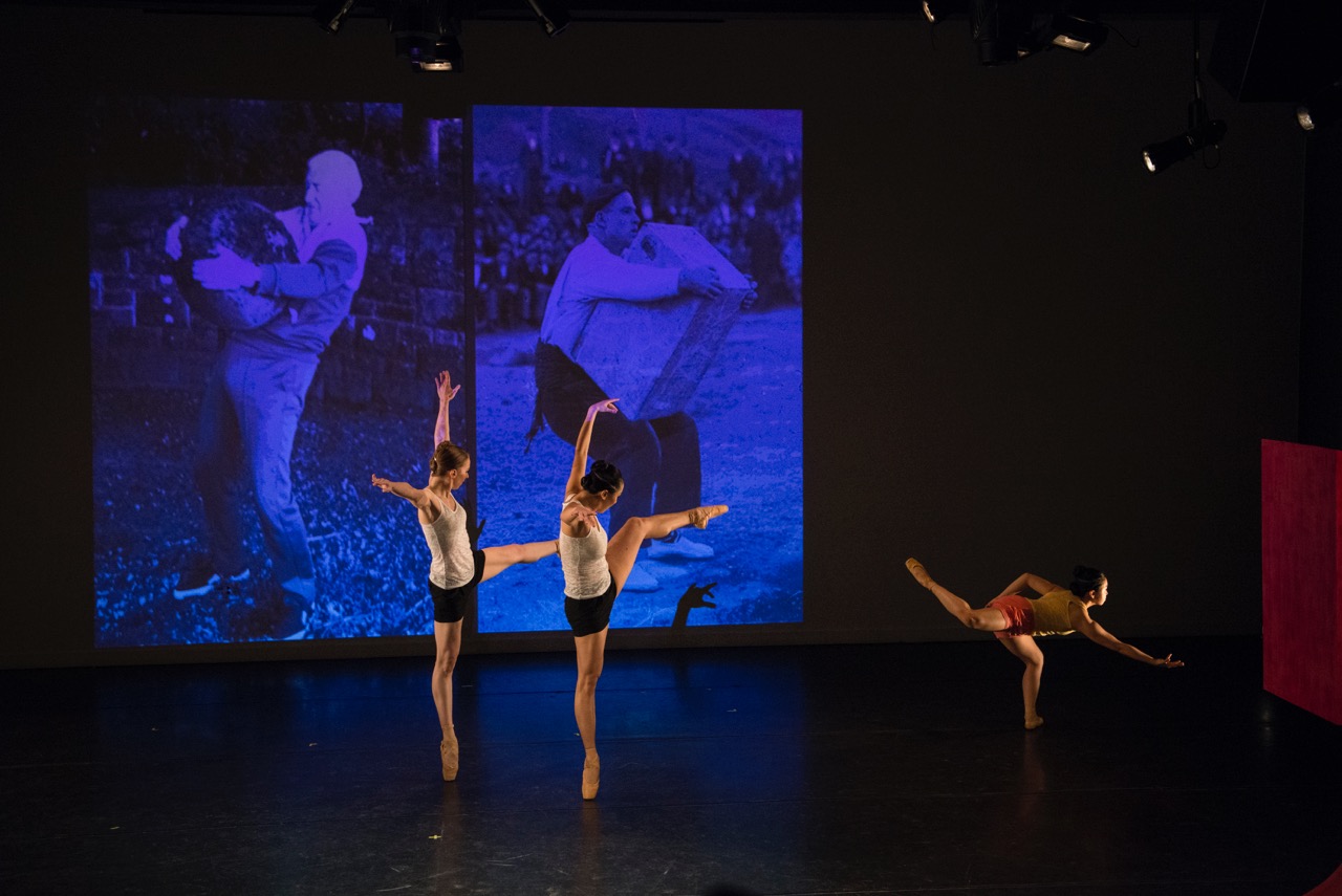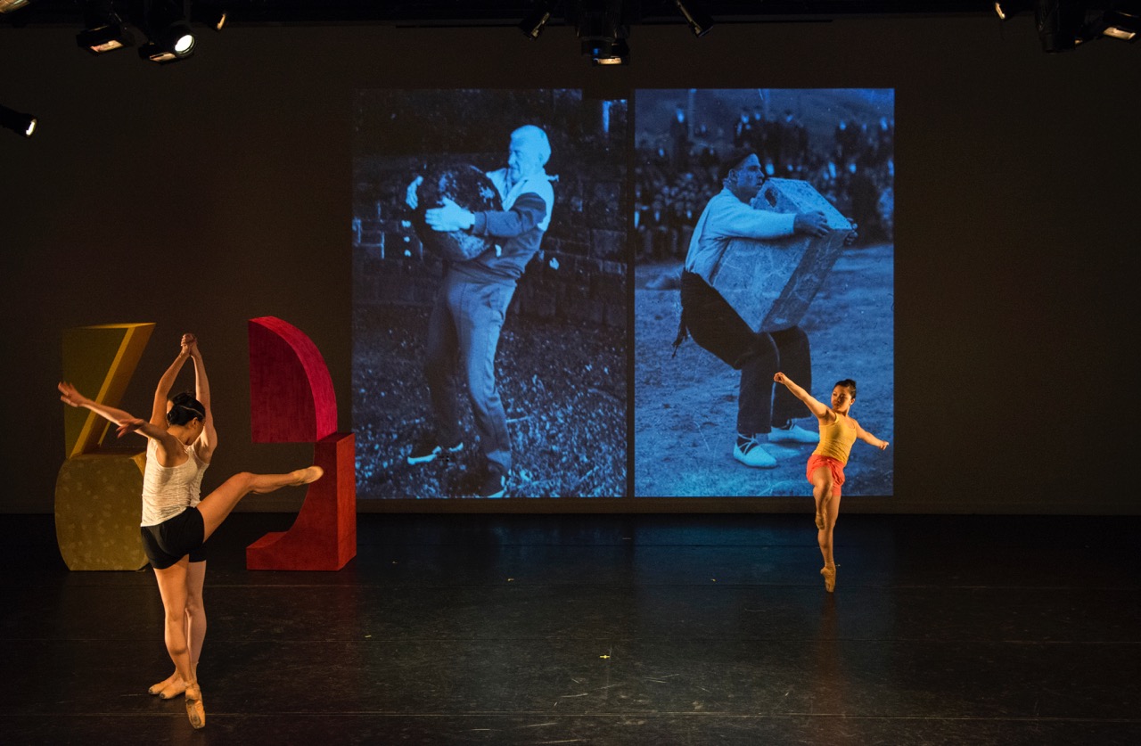 RB: The first sketches Julia sent me included the Donald Trump China mash-up and the “I�m a Man” song. In both cases there was a strong sense of masculine posturing and assertiveness with a bit of tongue-in-cheek. My sculptures have an idea of strength and toughness to them. I often hinge that idea on a very precarious fine point of balance. I have been looking at stone lifters as source material in my studio � the body counter-weighting the stone in this delicate balance that is also raw masculinity. The relationship of the two elements � body and stone � one part relying on the other part, one part holding the other part, along with the delicate balance and precision, the rough hewn geometries of the stones and the swagger of the lifters was something that spoke to my sculptures and also fit really well with what Julia was after. This combination of strength and precarious balance is a perfect match for dance, especially pointe.