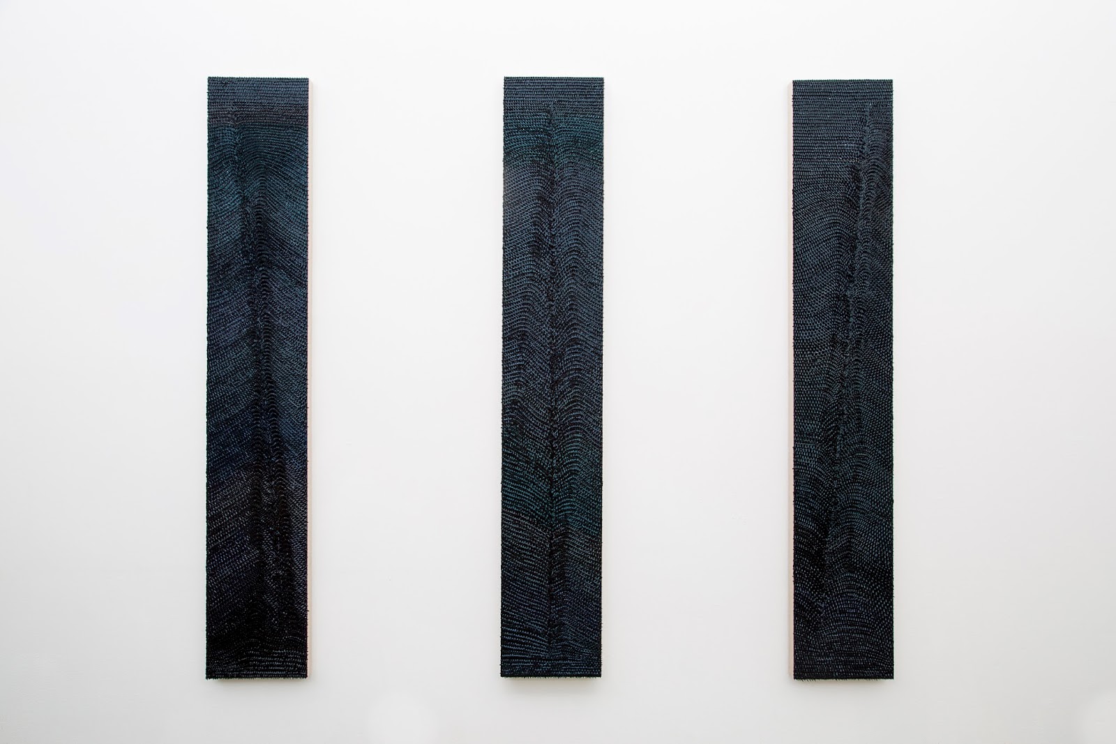 Update: Danielle arrived yesterday. Danielle Mysliwiec, assistant professor in the art department at American University, has arrived for a seven-day artist’s residency at Two Coats of Paint. Mysliewiec is no stranger to New York. She earned her MFA at Hunter, had a solo show in 2015 at Novella Gallery, and has been in recent group shows at Transmitter and Mixed Greens. Her monochromatic paintings feature densely woven threads of paint that remind me of the chain mail from the Arms and Armor Collection at the Met. I asked her via email about her plans for the residency.