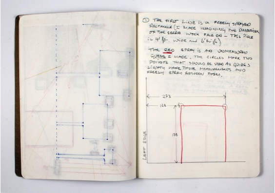 Using sketches and instructions from the notebooks, a team of artists at Colby created Permanent Maintenance. Soriano arrived at the forms of Permanent Maintenance by mapping, mirroring, and demarcating aspects of the Colby campus, and through seemingly irrational, intuitive mark-making only loosely tied to systems of representation. Throughout the drawing, his graphic signs seem based on visual languages designed to avoid ambiguity: architectural plans, surveyor�s marks, and mechanical diagrams. However, viewers who engage with Permanent Maintenance will find frustration a condition of the work. Inscrutable layered marks and notations (arrows, dash lines, X-marks) seem purposeful, direct. Yet to pursue these signs is to encounter a morass of lost information, directives impossible to follow, irrecoverable intentionality. Even as Soriano invokes causal systems, productivity, and the optimism of construction, he undermines the implied functionalism of the diagrammatic visual languages from which he borrows. The systems he evokes relate most immediately to the mechanical operations of the Colby campus. More broadly, these systems point to institutional structures, educational systems, and perhaps even the perpetual expansion and upgrading of the American college campus.