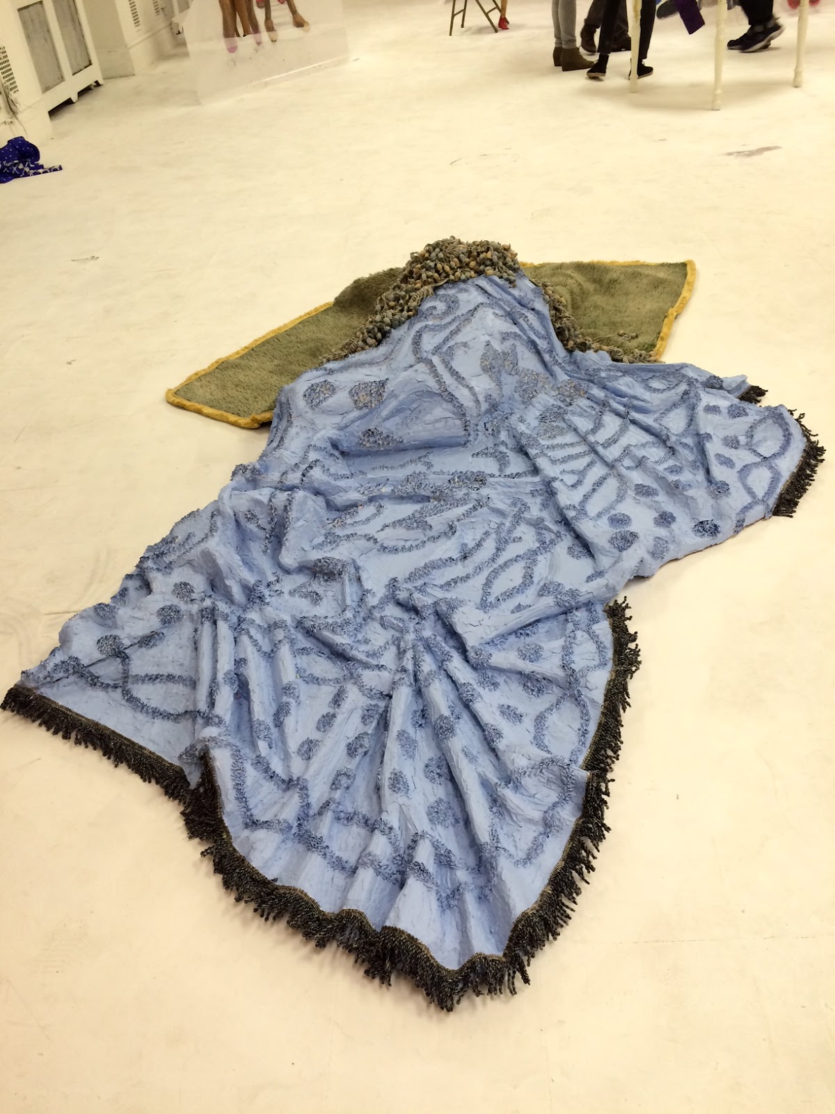 Alyssa McClenaghan, Thrown on the Floor, 2015, upholstery foam, joint compound, fringe, acrylic paint, marine polyurethane, 43 x 4 x 9 feet. Brooklyn College MFA exhibition.