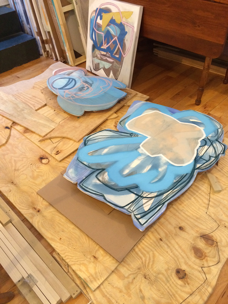 I first saw Justine Hill‘s paintings in “Metamodern,” a 2015 group show at Denny Gallery that explored the contemporary fusion of Abstract Expressionism, Minimalism, and Primitivism. Her shaped canvases seem to jump off the wall with their unexpected amalgamation of Modern abstraction, postmodern humor, and the uninhibited brio of old-school graffiti taggers. In a recent studio visit, Hill shared work that she’s making for her forthcoming solo at Denny, and we talked about her process. [Image at top: Paintings on the wall in Justine Hill’s Bushwick studio.]