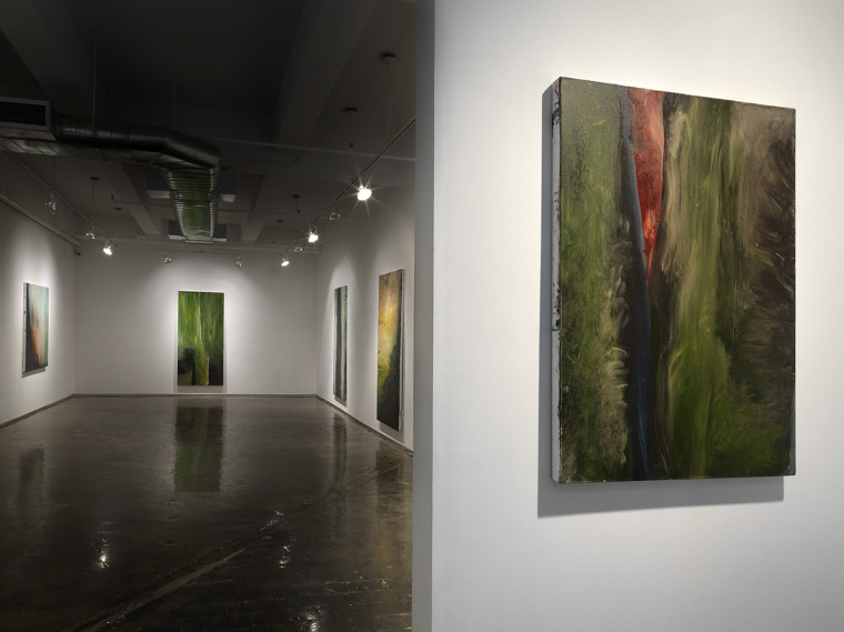 The paintings are anthropomorphic not only in scale, but also in their logic of fasciae, tendons, and ligaments. When the pressure of stretcher bars against canvas creates parallel lines of more transparent paint on the surface, those lines feel less like a disruption than a vein pushing up against thick skin. When the vibrant, seductive, red triangular form of Untitled, October Painting #8 (2015) is revealed in the parting of heavy green strokes, it reads as living flesh, thick and bloody, not found in any other painting. Its position in the gallery’s foyer is then almost too revealing, representing the core of the space before the space has made itself felt.
