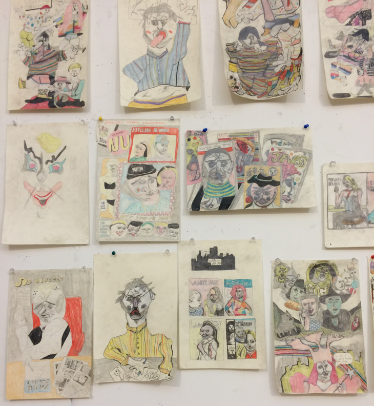 Austin English makes books. His studio was full of wildly imaginative pencil drawings that swing between comic book art and surrealism with text and captions scrawled throughout. His previous books include