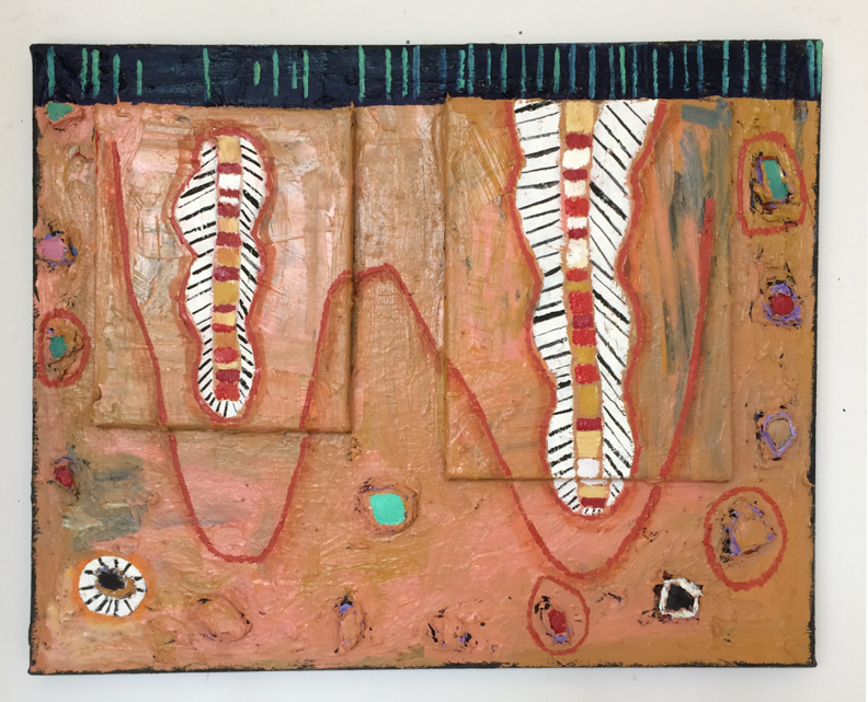 Yevgeniya Baras makes intimate abstractions that incorporate sewing, embroidery, and wood carving. Interested in the collective unconscious, Baras has developed a series of symbols and pictograms that appear throughout her heavily reworked paintings.