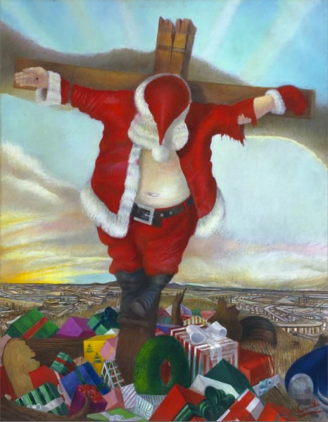 Cenedella frequents bars, thrives on street life, and privileges his own subjectivity. In this, of course, he is not unlike many anointed artists who are part of the art-historical canon: Toulouse-Lautrec, Modigliani, and the Cedar Bar denizens among the AbExers themselves, as well as Bellows, come to mind. Yet whereas the granularity of Bellows�s work imparts a kind of elegiac graveness to what he is depicting, Cenedella�s loose, expressionistic brushwork and in-your-face sardonicism � a hockey player with a stick up his ass, for instance � registers mainly snide, irreverent lament that jars against true Ashcan realism. The attitude is perhaps philosophically akin to a young Grosz�s, but Cenedella�s bright colors and broad humor keep his work on the surface, and bar it from achieving the mournfulness and Dadaist urgency of the German painter�s pre-emigration years. Even so, Cenedella�s infamous The Presence of Man (1988), depicting Santa Claus on a crucifix above a pile of wrapped Christmas gifts, is a bull�s-eye of Hallmark irony.