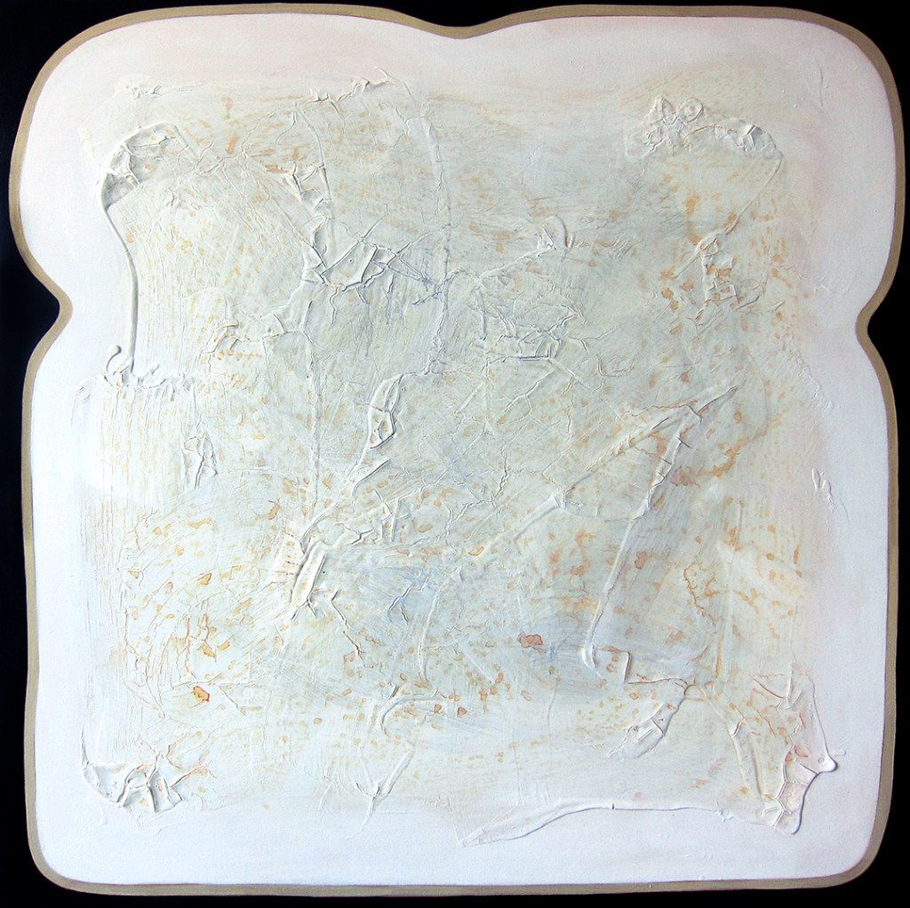 Jen: Ok. Another thing I’m trying to deal with in my work is the history of painting. Taking abstract expressionist moves, for example, like the icing on the blueberry Danish – that’s my chance to be Jackson Pollock for a minute. The breads with jam are like Mark Rothko color fields within the confines of the bread. The one called “White on White” which is a little joke on Malevich’s painting of a white square on white. I’m trying to have fun with art history. I think about the checks on that checkered tablecloth on the sandwich painting are sort of like Renaissance floor pattern —
