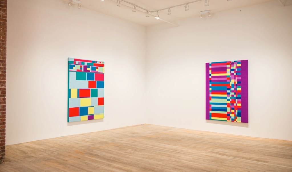 Contributed by Marjorie Welish / Rafaël Rozendaal’‘s “Anti-Social” is polyglot, and speaks all at once. Stretched on a support for canvas is a Jacquard textile that professes both web information and an intuitively arrived at design compatible with painting. The basis for these compositions is the internet screen; and although stripped of words, the images are still identifiable as Google, Google Dox, reddit, and others, wherein an algorithm creates a recognizable order, that beauty overlays in arrhythmic disorder. Giddiness beyond prettiness.