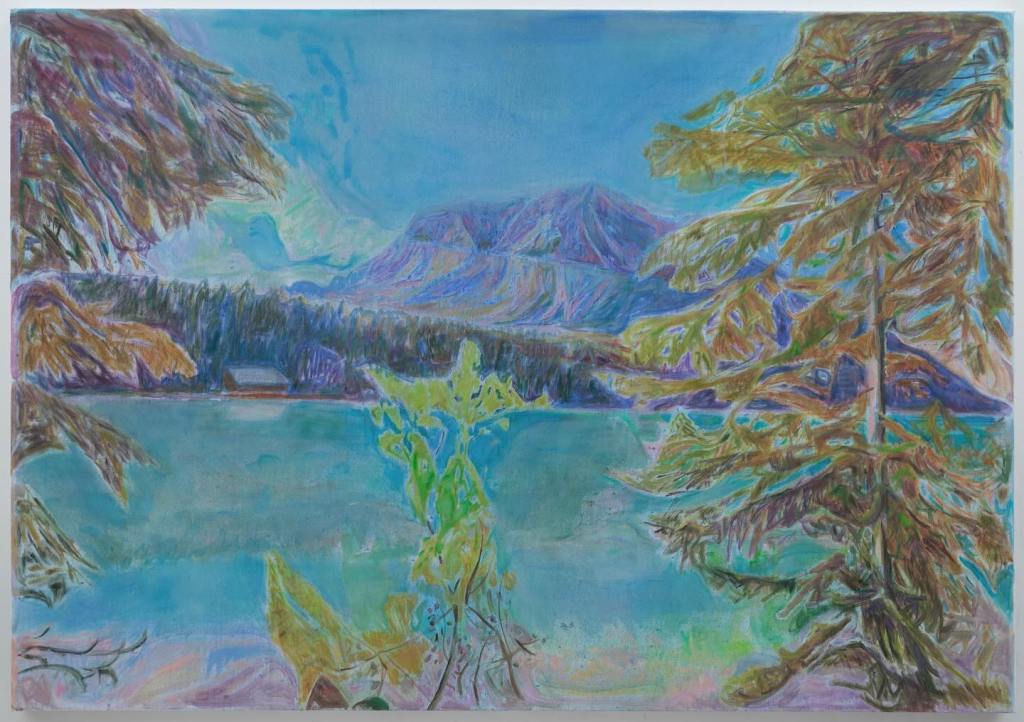 The four larger oils – 60 x 50 inches or 60 x 65 inches – encourage us to face the solemnity of Mother Nature and at the same time feel almost casually encountered. In between dabs of paint, the canvases breathe, hinting at a speed or facility in execution and imparting a lightness of touch. In Borca di Cadore, Kodachrome pinks and purples soften a distant rock formation’s boldness, receding into a scenic drapery beyond a thrust of trees jostling for prominence along the painting’s left side. In Lake Louise with Lodge, a bubble of turquoise nestles within a jittery landscape of brushstrokes, as steadfast as the mountains that overlook it. The two-toned lake resists settling quietly into implied space as it reflects the land rising at its edge.