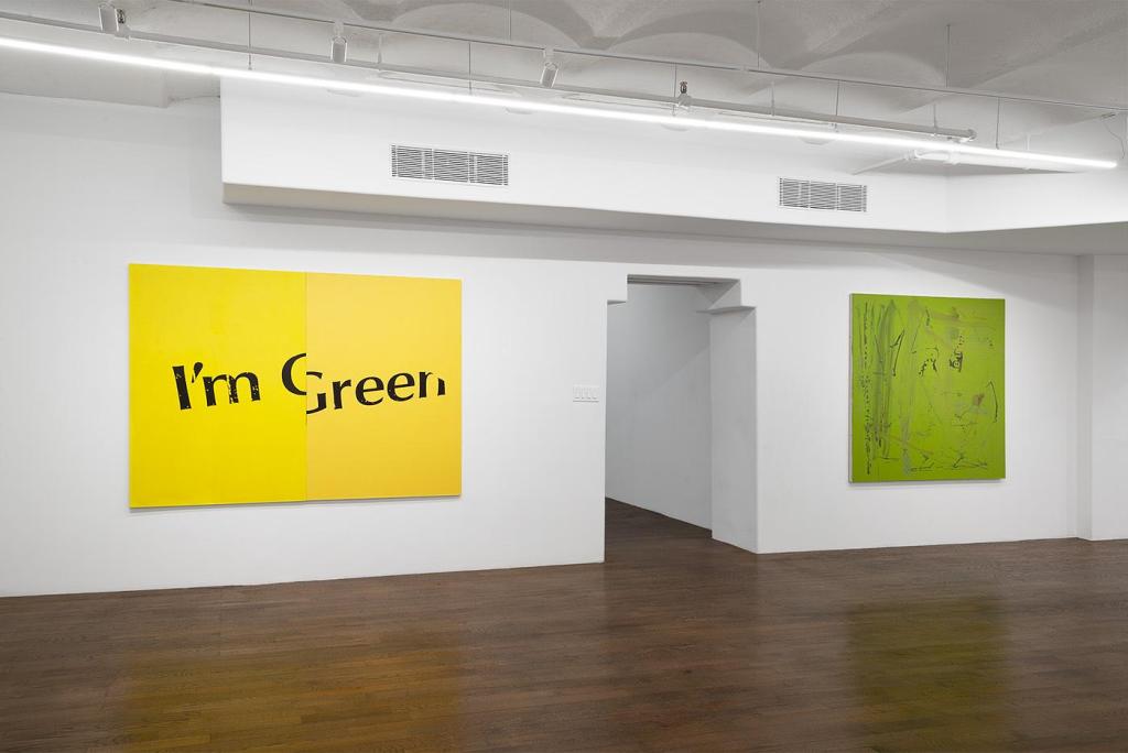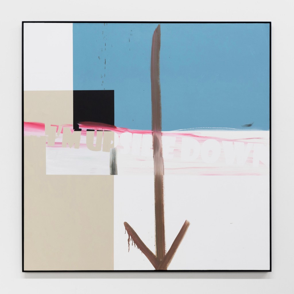 The sheer range of angst that Meerow covers in a mere eight works is impressive. The painting I’m Green, which unabashedly presents that lie in shambolic black typescript against an expansive yellow acrylic background, can’t help but conjure the insouciant disregard for truth facilitated by near-universal digital access. In counterpoint, 2020 is a nauseous green, but the apparent verbiage it contains is hopelessly fragmentary and obscured: what happened that year may be incomprehensible, but we know how it made us feel. Flip Me Over, depicting three intersecting hard-edge rectangles overlaid with the washily-stenciled phrase “I’M UPSIDE DOWN” and a clunky downward arrow, commands the viewer to avoid looking by means of an act not permitted in an art gallery, imparting the structural prevalence of exposure over privacy.
