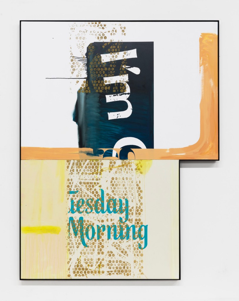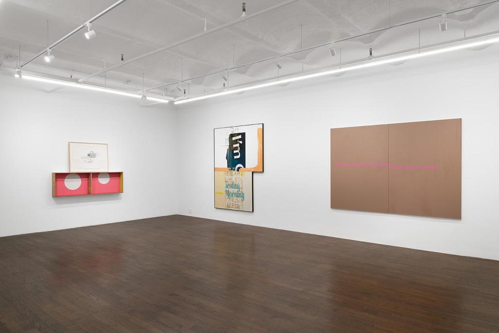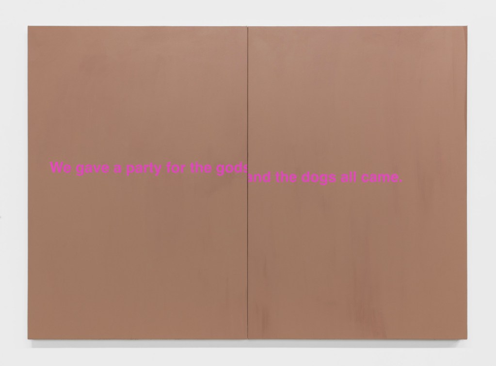 No doubt Meerow is hip to the grave urgency of the immediate situation, America’s national life having become one long-running B melodrama not unlike the 1968 Democratic National Convention writ large and the wider world roiling. But he also reflexively sees the potent irony in all the handwringing, sourced as it is in willful blindness, and here his provisional calibrations strike an apt chord. In a third untitled piece, nonchalantly composed on paper, a coffee mug featuring a petulantly smiling face reminiscent of Ernie the Muppet has tipped over, spilling its contents in an agreeably lyrical meander. Messes can be funny, even endearing, when they’re manageable. Less so, of course, when they’re not. In and all the dogs came, Meerow splays the line “We gave a party for the gods, and all the dogs came” across two panels in naively celebratory magenta against a fecal brown field, riffing on John Giorno’s poem by replacing “gods” with “dogs.” In that sardonic diptych, he captures the promise and disappointment of this century so far, essayed in an arresting exhibition, without losing his sense of humor.
