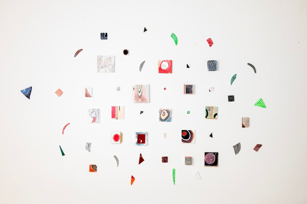 Contributed by Sharon Butler / While nostalgia and the yearning it precipitates may be gripping the art world, Cordy Ryman’s gently dazzling painting installations, on view at Freight + Volume, are unapologetically about the here and now – that is, what’s happening in one place, today. Titled “Monkey Mind Symphony,” the show captures the distractions we encounter day by day, minute by minute. What could be more apt for our time than a visual language comprising more than a hundred small, curious objects? Logically, they are the physical manifestations of tweets or threads, crafted easily, sometimes beguilingly unfinished in the traditional sense of the word, and arranged so as to radiate Ryman’s idiosyncratic energy.