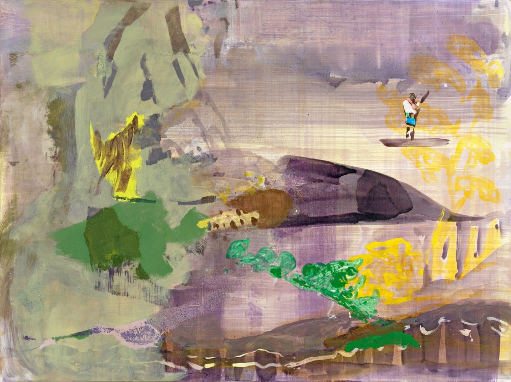 Consider, for example, Camp VIII. It’s easy to identify the two seated figures center to the left, but what of the enclosure behind them? Or look at the exquisite Shan Shui VI, where the small standing man at the upper right is submerged in a violet, yellow, and green landscape. As Richard Diebenkorn could transition from figuration to abstraction in successive paintings, Na Kamura can do so within a single work. What, then, holds it together? In a word, the answer may be color. Claim of Joseph I plays a large expanse of ocher against green, blue, and dark red in a stunning gestural composition. Unit VIII sets two shades of green against myriad colors, mostly dark.
