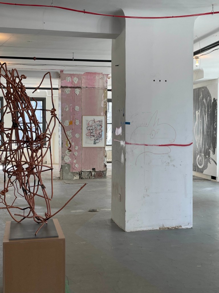 The site is clearly between tenants, with exploratory holes in the walls, scrawled graffiti probably left by workmen, and exposed wiring. It’s the kind of raw space that once was readily available and affordable for artists to rent in NYC. Natural light fills the space through multiple windows on all four sides. It is startling just how in sync this setting is with the art on display. Wool’s work has always referenced the elemental: drawing as scrawl, painting as spill, sculpture as jumbled metal. Everywhere you look the art echoes the dereliction of the space, such that space and work uncannily merge. Even while focusing on a single piece, you are aware of the exhibition in its entirety.