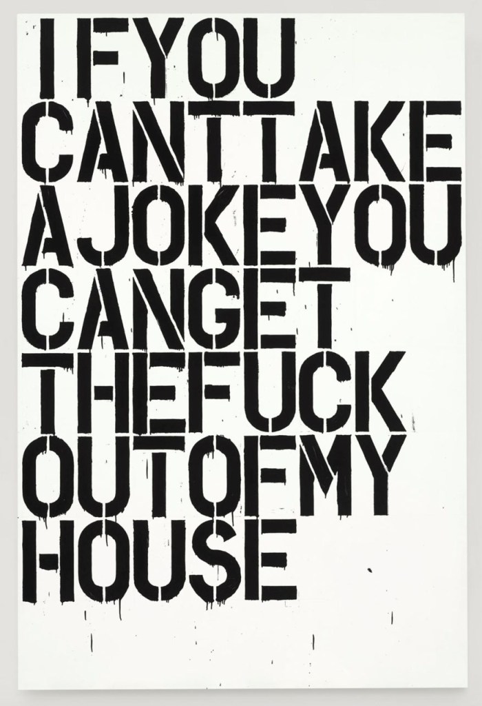 Throughout his career, Wool has made the painterly interesting by bringing it through the back door, like an uninvited guest. Using rollers, stencils, silk screen, spray paint and appropriated text, he has continually surprised viewers with his ability to make the seemingly offhand visually compelling. While the text paintings registered for some as iconic emotional outbursts (“IF YOU CAN’T TAKE A JOKE, YOU CAN GET THE FUCK OUT OF MY HOUSE”), the emphasis was equally on materiality, just as it had been with earlier work that used pattern-making rollers, which slumlords favored to paint over shoddy plastering jobs. Both series employed wet-on-wet enamel paint. Wool seemed to be seeing how far he could stray from traditional painting without losing the essential juice. He was pushing the parameters in a way that felt knowledgeable, as exploration rather than wholesale disregard or rejection. The text paintings were pictorial in a way that those of Jenny Holzer, Joseph Kosuth, Barbara Kruger, or Les Levine never were.