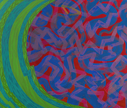To picture something, even a geometric shape, in an imaginary space was heresy to high modernist purists because it undermined the full actuality of object, place, and process. While the art world is richer for the relaxation of these precepts, Thorne highlights the hope and belief that lay behind them by placing them side-by-side with their opposite. In Orango, a row of concentric green arcs – complicated by her signature trembling – frames a riotous zone of magenta, cobalt, and powdery violet. Only after some deciphering does the sequence and nature of layers become apparent, as the literal and the illusionistic interpenetrate. In this painting and others, the brushstroke, inherently metaphorical and culturally loaded, operates in the tactile space of the painting’s construction.