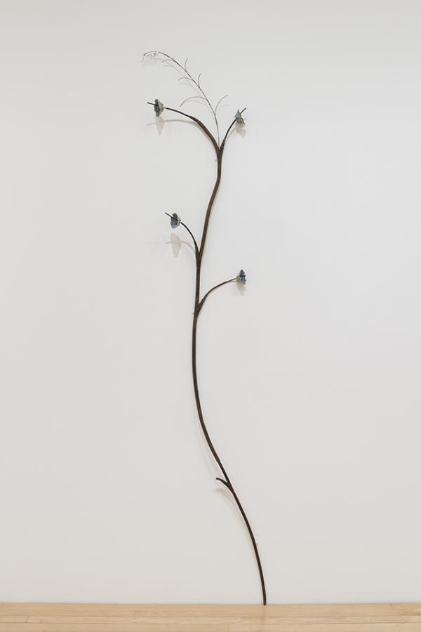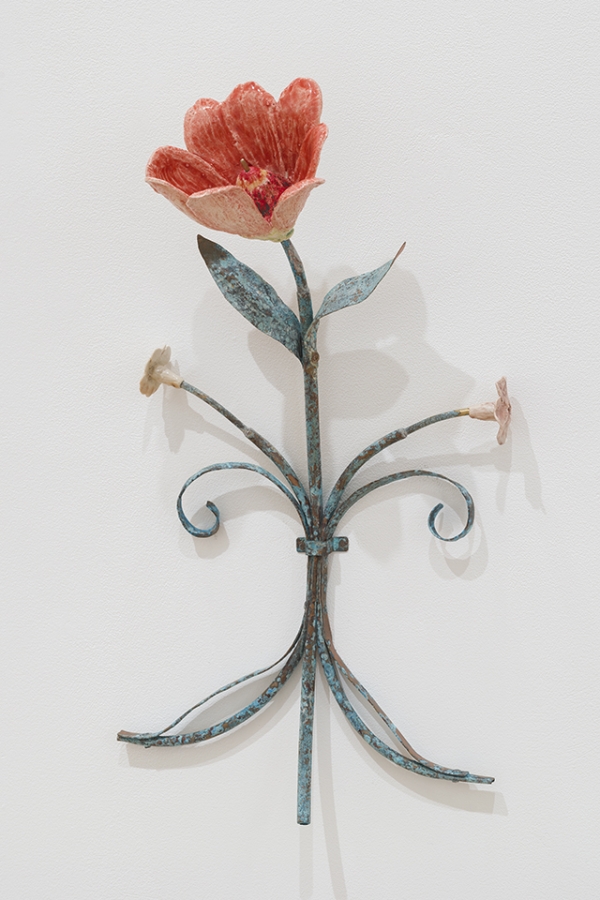 This is the first time Carlson hasn’t displayed her figurines on pedestals. They sit on irregularly carved wooden shelves, intertwined with the spiraling vines. Metal workers have been shaping copper for millennia, but I’m pretty sure Carlson uses the actual copper pipe that a Catskills homeowner like herself might have on hand. Out of it she creates beautiful, flowing forms that maintain the material’s identity as a vessel designed to carry fluids. Some are disconnected from human figures, sprouting porcelain flowers. There are also sculptures of single flowers on curling shoots. Nature dominates. Carlson’s flowers take their place in the recent resurgence of floral imagery in art galleries – prompted, no doubt, by climate change and a heightened awareness of the fragility of nature in the Anthropocene.