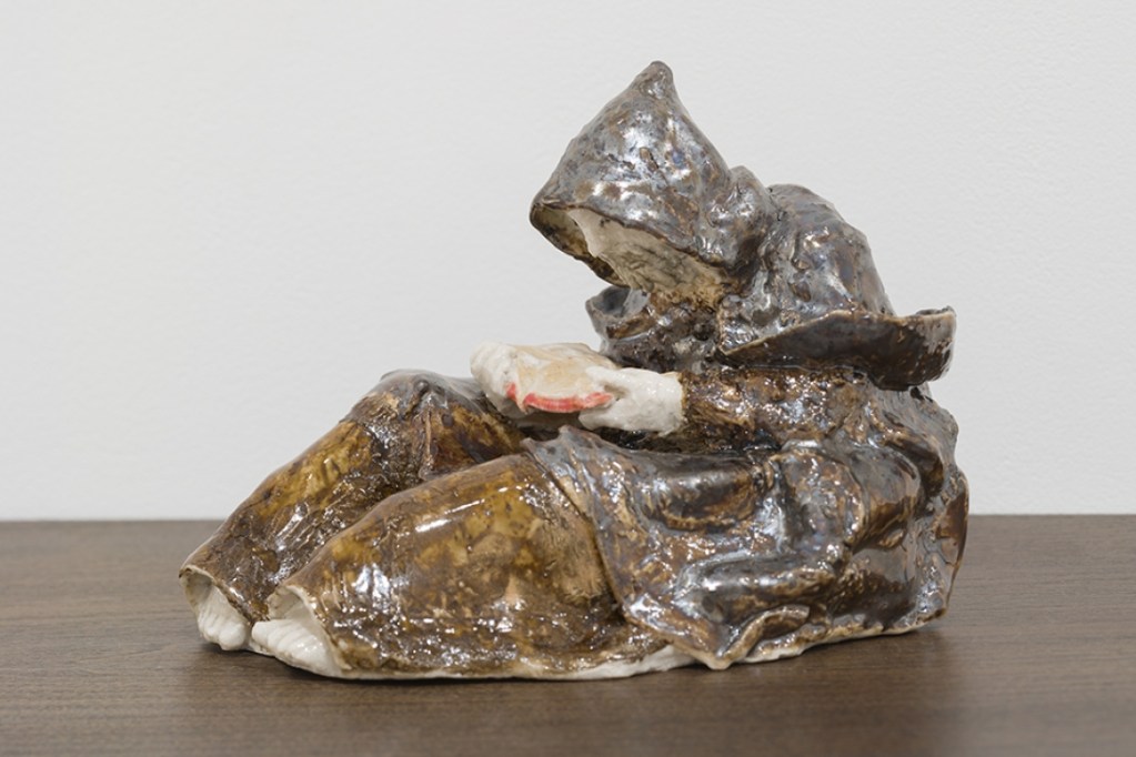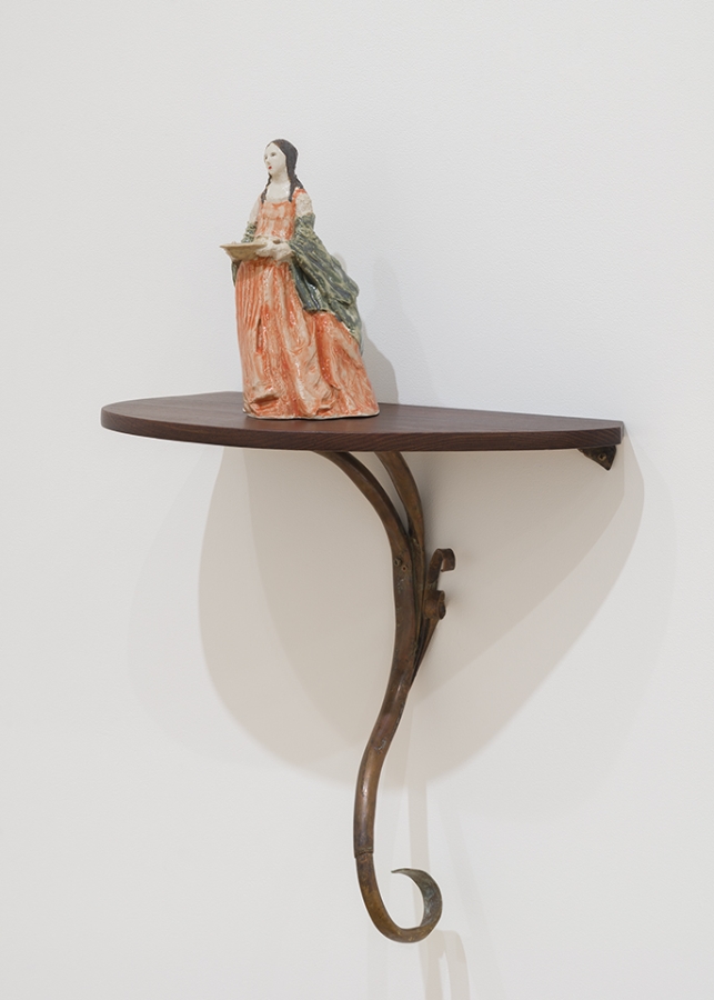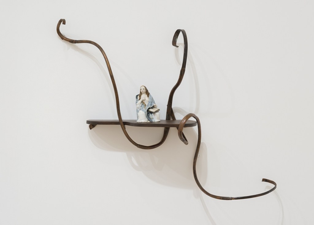 Contributed by Adam Simon / I happened to visit Mary Carlson’s exhibition “Garden” at Kerry Schuss Gallery the day I finished reading Titus Groan, the first of Mervyn Peake’s Gormenghast novels, written in the 1950s. I’m not usually drawn to fantasy fiction – this book was a gift – but Peake’s dreamlike rendering of a forbidding castle with clinging ivy and bizarre inhabitants had me in thrall, primed to receive Carlson’s medieval world and its symbiotic relationships between plants and people. One of the characters in Titus Groan uses the ivy to scale the castle walls, while two others take tea on a tree that grows horizontally out one of the windows. While not exactly ivy, vines fashioned from copper piping figure prominently in “Garden,”often dwarfing the mostly female glazed porcelain saints that sit on modest carved wooden shelves. The untamed power of the natural world, and humanity’s marginal presence in it, is an underlying theme in “Garden” and very like the world described by Peake.