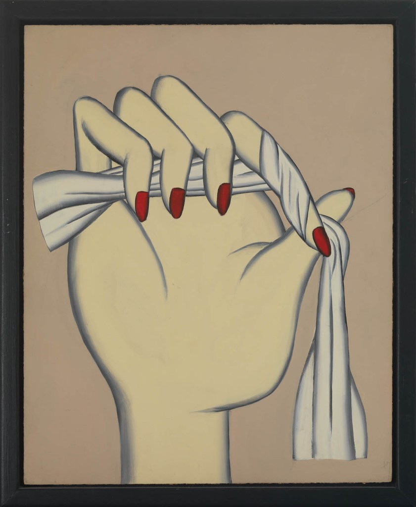 In the 2013 documentary film, Hairy Who & The Chicago Imagists, Ramberg said her paintings “could be a little bit pornographic, hands feeling, caressing, masturbating the body” and that there were also “implications of rape.” These are edgy thoughts, to be sure, but the crucial words to keep in mind are “a little bit.” Elsewhere, she also said that as a child she would watch as her mother, dressing to go out, pulled on a “merry widow” corset that pushed up her breasts and squeezed in her waist. She saw this as her mother attempting to transform body into the kind men wanted and found it both “fascinating” and “awful.” It’s reasonable to speculate that this precocious early puzzlement was the source for the uncanny beauty and candor of her paintings.