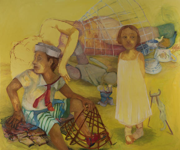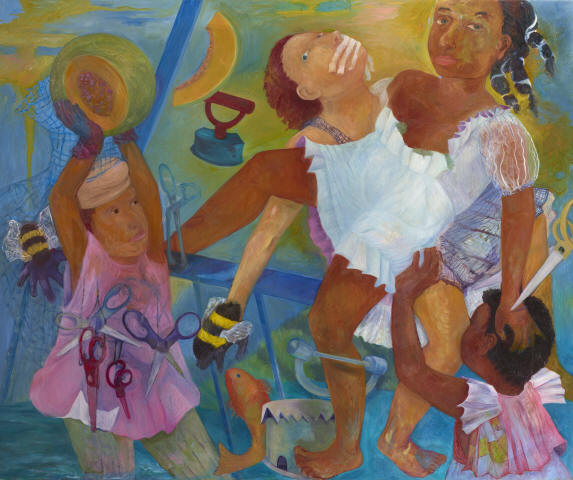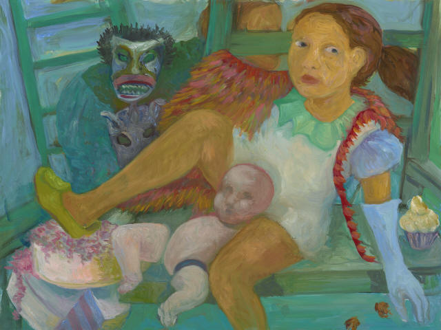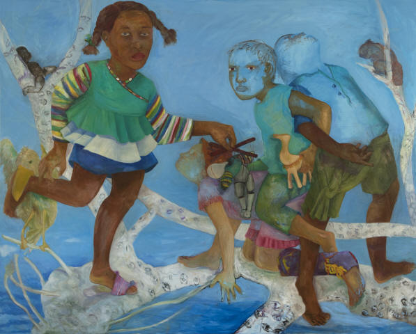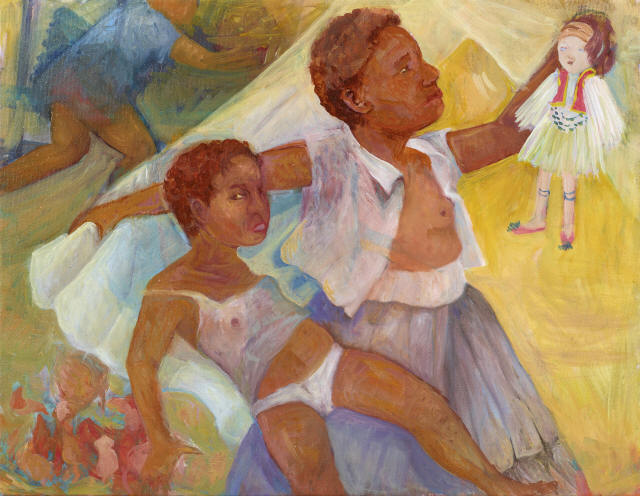 In The Light of the Gingko, there are four or five figures, some obscured and two of which could be dolls. An event is unfolding, but the nature of the place and the details of the action are unclear. Most of the characters appear to be adolescents and seem off-balance, underlining the liminal and potentially disruptive aspects of the scenario. Their race, gender, and identity remain ambiguous. Some clues do appear, but they are hardly conclusive or, therefore, interpretatively confining. The figure to the left is dressed in a sailor’s outfit, and the one above it, more sketchily rendered, appears to be sleeping in a crinoline garment. In the figures’ placement, the vague state of the horizontal one, and the canvas’s relatively large scale, the painting is reminiscent of Degas’ The Bellelli Family. Like him, Williamson masterfully conveys a complex and fraught social and psychological state without overt narrative mediation.