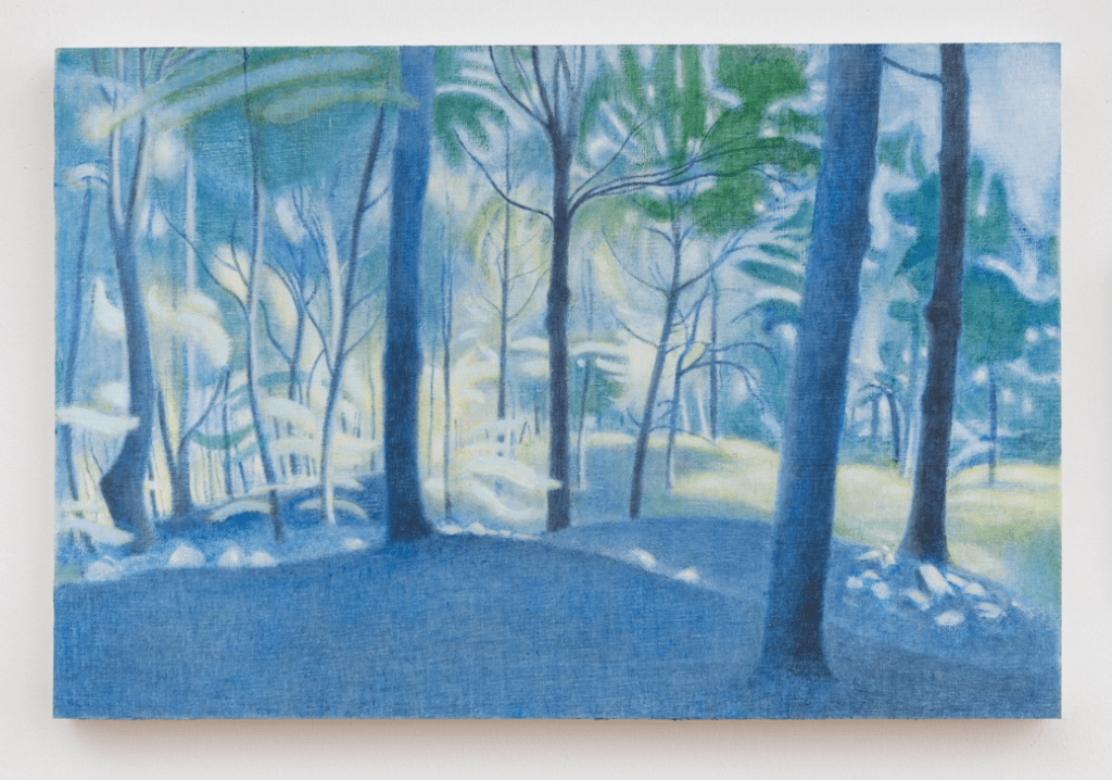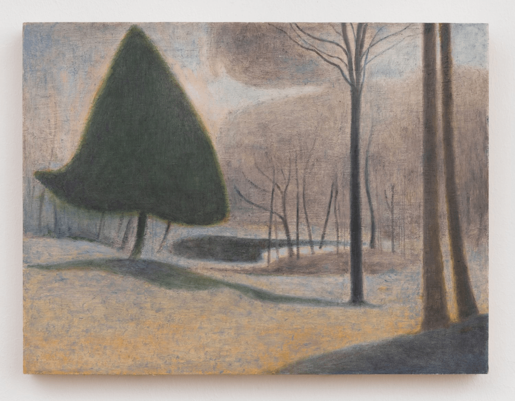 French connections aside, it’s hard not to read an idealized America into Milewicz’s paintings. He works upstate, in the lower Hudson Valley, near Gallatin, NY, well east of the “burned-over district.” Yet his woods are slightly haunted, inhabited by observation, perhaps. They seem to have a kind of spiritual persona, as in the transcendentalist literature of the American Renaissance – especially in the works of Cooper, Hawthorne, Melville, and Poe – though Milewicz’s forests are not menacing. Milewicz achieves this effect through deft control of value: a painstaking adjustment of lights and darks.