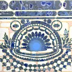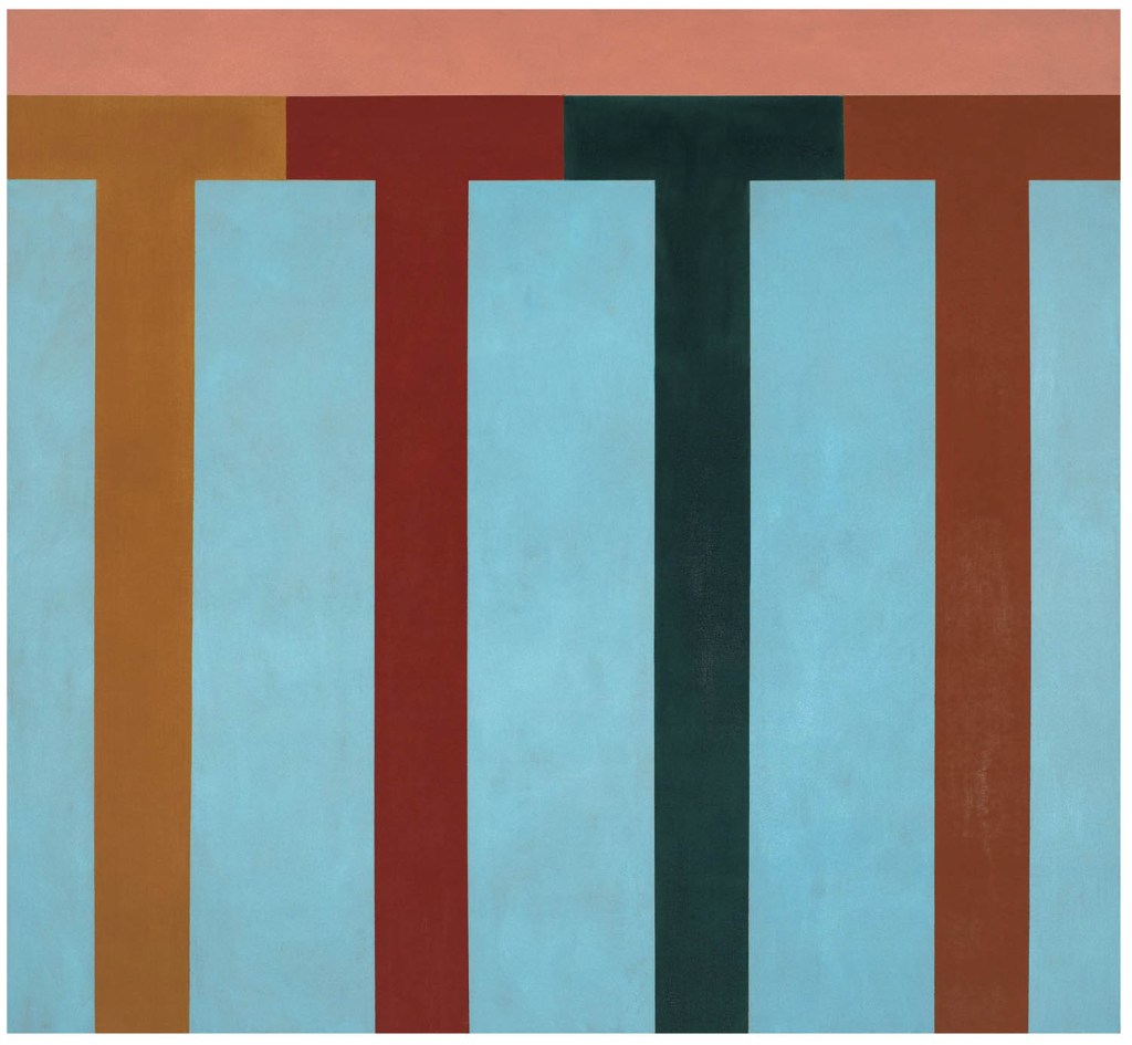 No mere formalist, Uchiyama is explicitly interested in the fluidity of inside and outside space, which broadly aligns with that of comfort and risk. For all their structural calmness, her paintings – especially the predominantly blue Portico 4 – can convey the paradoxically languid emotional turbulence of, say, Antonioni’s L’Avventura. This characteristic derives from Uchiyama’s carefully gauged gradients of paint – more pronounced in Blue T, a small work on paper – and her incisive deployment of colors, which range from intense green and soulful burnt sienna to more delicate blues and pinks, as well as her choice, at times, of no paint at all. On account of color, three geometrically identical paintings– Abaton, Golden T, and Stoa – are leagues apart in mood and implied season. While regimented symmetry can impart flatness and confinement, here, with such nuance, it captures life’s depth and variability in a paean to baseline contentment.