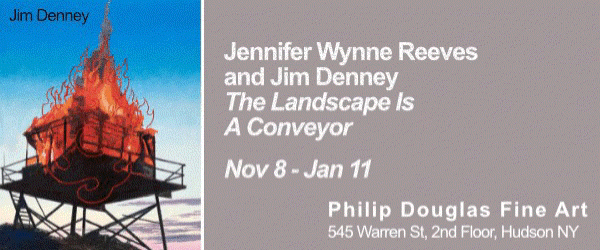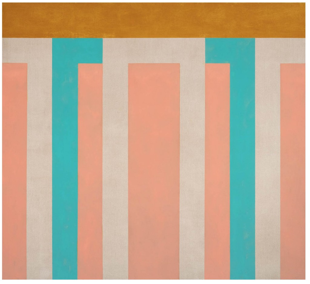 That quality could embed a political viewpoint, but Uchiyama’s primary intention is likely more philosophical and less argumentative. The natural and the artificial are not in overt conflict – the titular fabricated construct being an open-air one – and the premium is on harmony and seamless transition, starkly underlined by the elegantly architectural cast of Equinox. In the consummately complex Threshold, which occupies center stage in the gallery, serifed vertical strips of turquoise infiltrate columns of adobe pink and raw linen, moored by a murkily enigmatic ocher banner, incongruously Marden-esque, across the top of the painting. It’s a resolutely non-objective work, yet it holistically summons such subtle existential pairings as liberation and security, serenity and suburbia, idyl and ennui.