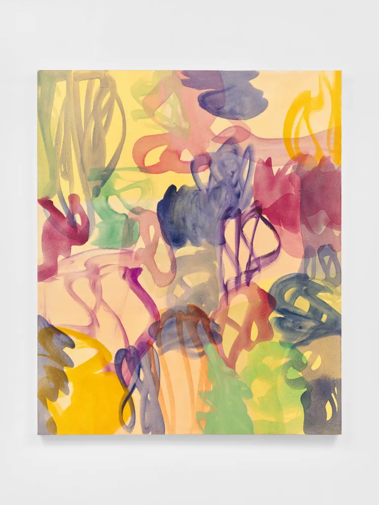 Yet the early 2000s marked a breakthrough for Meyer. As if reaching a clearing in the woods, her paintings became luminous and spacious. Figure and ground were visibly differentiated and glowing with golden light behind translucent violets, magentas, ochers, greens, and ultramarine blues. She was honing her signature style: jewel-toned, calligraphic marks over pale – often yellow- or peach-toned – grids with oil paints thinned to the consistency of watercolor. This shift was well-received, and she garnered several large-scale public art commissions, including multiple mural installations at the Shiodome City Center in Tokyo in 2002 and the Queens Hospital Center 2003.