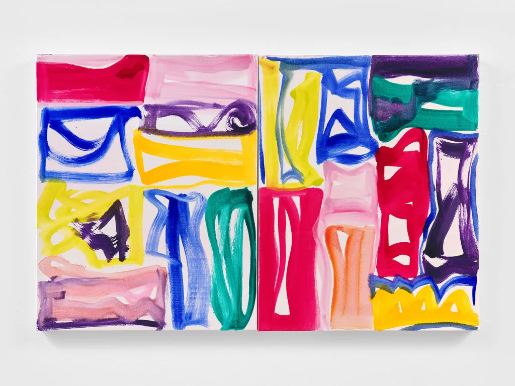 Five of the ten paintings on view date between 2021 and 2024. Some nuances have changed but key aspects have endured. Meyer’s approach and technique have remained largely the same over the last 25 years. The thin consistency of her oil paint has necessitated a horizontal approach, whereby she composes paintings flat on the floor from above the canvas. This all-over method allows her to balance the composition thoroughly, according due attention to each side and angle with the grace of a choreographer developing a dance or a yoga practitioner in the flow. The subtle yet notable change in these works is the diminishment – sometimes the absence – of the warm grid of patchwork pastels that Meyer invoked for decades. Her jewel-toned characters are now more saturated, in primary and secondary hues against a cool, bright white ground.