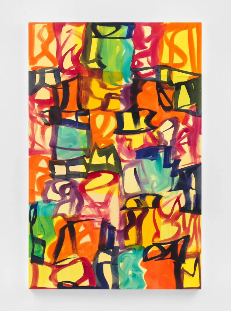 The earliest painting on view in “Throughlines,” She Belongs to Me from 2003, is a shining example of this watershed moment in her work. The colors are warm and floral. The gestural marks become figures in their own right, each occupying its own space on the stage, as it were, sometimes overlapping one another but always with calculated poise and rhythm.