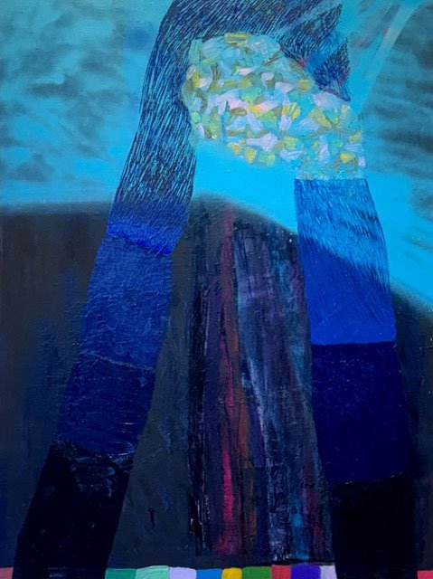 Some of the paintings seize on hovering anxiety. In Maverick, Fran Shalom presents abstract shapes that are eerily discomfiting, a feature somehow affirmed by a blotchy blue interior. In the four-panel Blue Boxes, Sharon Butler tracks the contingent interplay of nature and the human hand, resonating fear as well as hope. Judith Simonian, in her majestic yet busy forest-and-river landscape Walking on Water, may have kindred concerns in suggesting both the enterprise and the arrogance of the species. So might Vicki Sher by way of Night Shade, which registers the casual encroachment of dark blue vertical shapes on bright colors. Barbara Friedman’s arrestingly kinetic Castasterized into the Blue poses an epic reckoning, beautiful and violent.