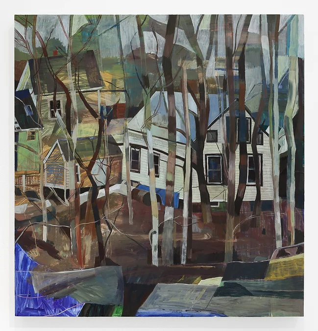 Stern’s landscapes, likewise constructed in a sparkling fugue of shifting viewpoints and positive and negative shapes, have a decidedly different emotional tenor. If the interiors seem safe, warm, and inclusive, his views of houses seen through the trees feel more alienated and marginalized, like a queering of the landscape. As in Cezanne’s views of Mont Sainte-Victoire, in which the mountain is always seen from a distance, the house in House on Mechanic Street and similar paintings feel set apart and perpetually unattainable; an effect amplified by the unstable ground at our feet. By the same token, the stockade of trees might also suggest containment, hinting at the confining, stifling, or even threatening aspects of domestic life. Either way, Stern’s landscapes present a more conflicted relationship with the idea of home than do his interiors, demonstrating his remarkably wide command of psychological expression.