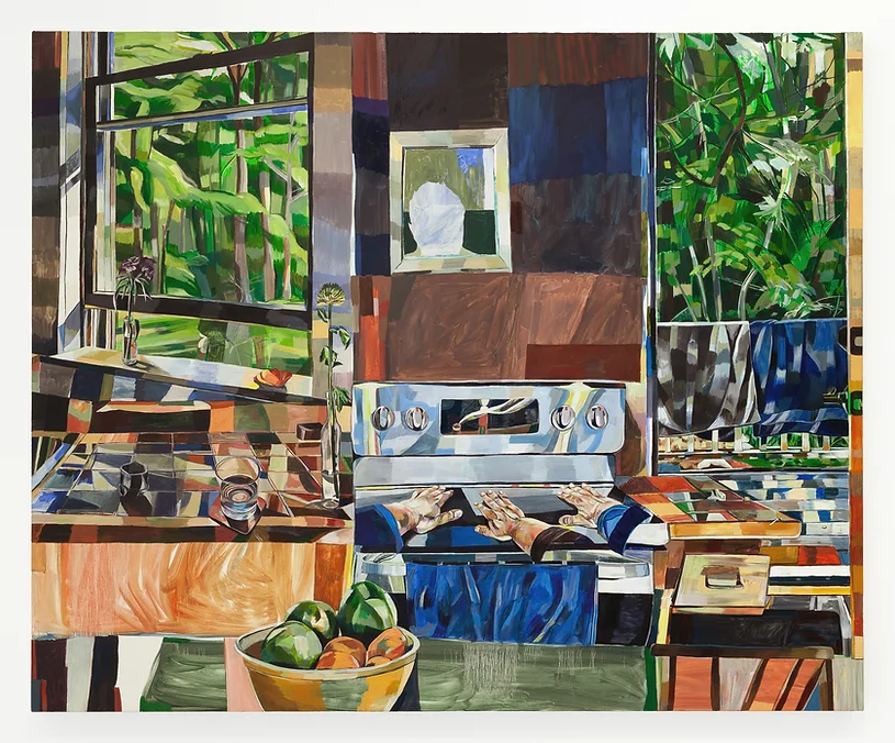 An exception to the absent figure is Forever Suspended in a Doorway (Self Portrait), in which a schematic self-portrait, reflected in a mirror, appears in the center panel even as its ghostly or provisional quality also suggests absence. Just underneath it is another fragmentary figurative element, the curious image of three hands resting on a stove top. Below this is what appears to be a dishtowel hanging on an oven handle, though it might also be the cropped midsection of a partial figure, dressed in jeans similar in color to the blues on the shirt cuffs just above it. If so, this spectral figure, standing at the stove, would align perfectly with the portrait in the mirror, completing this fragmentary apparition subtly but convincingly.