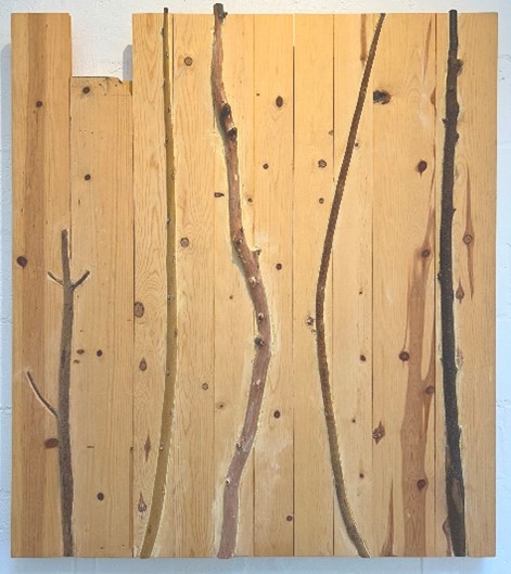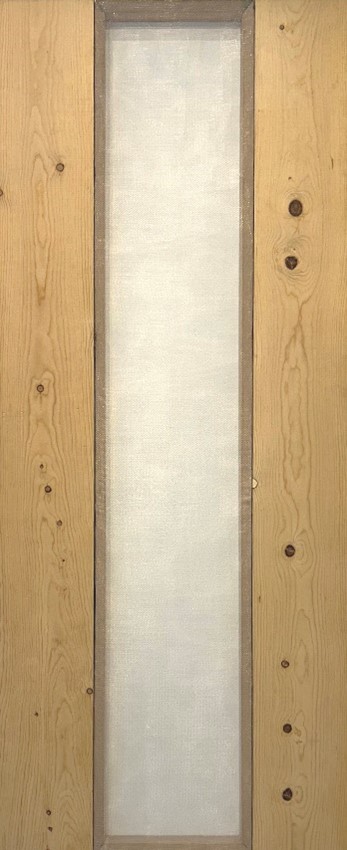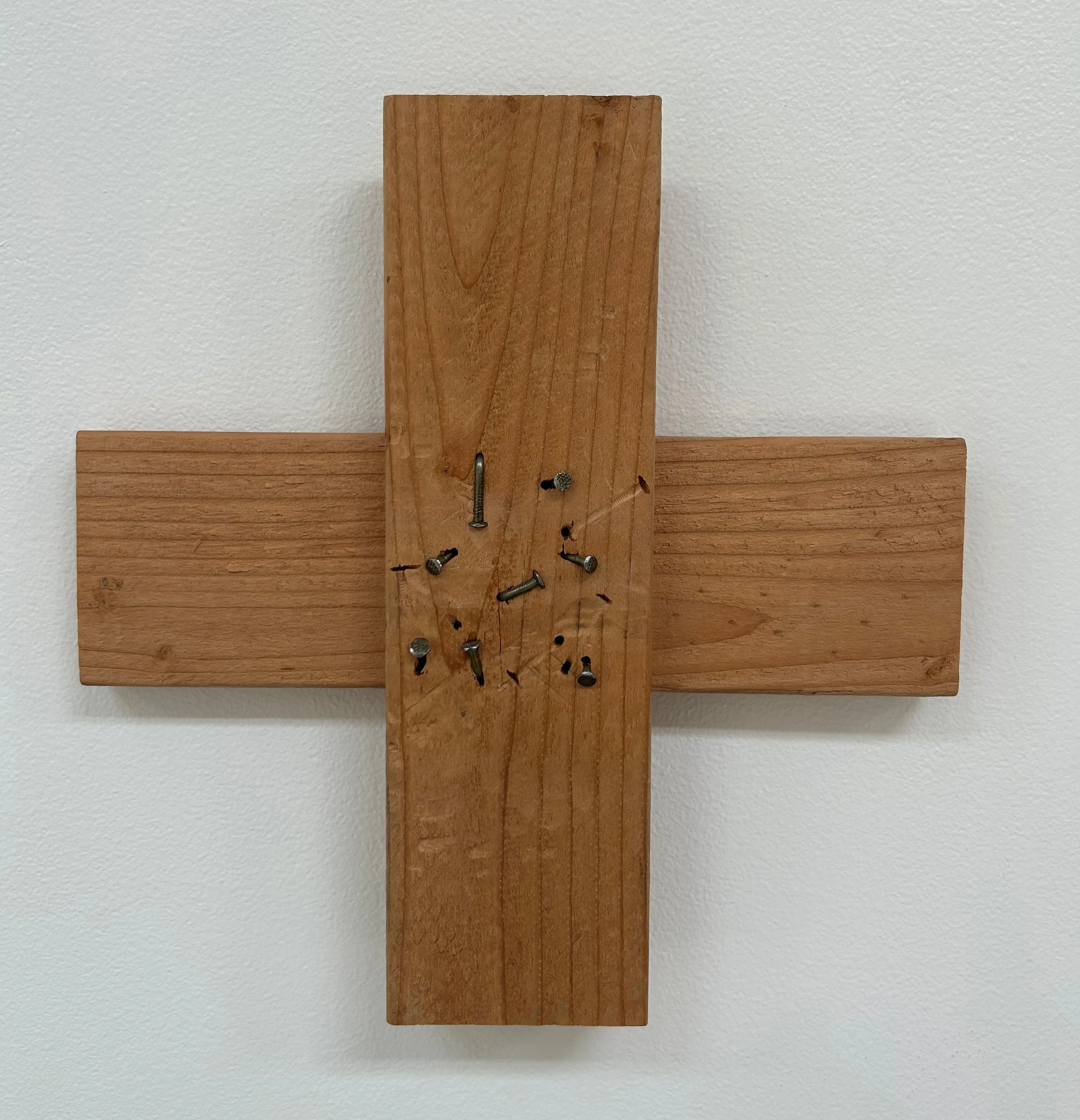 Speak Low is two vertical pine boards separated by a frame stretched with screen-door material. The screen material creates a soft-focus vertical rectangle between the hard edges of pine and alludes to something unseen on the other side. The title suggests not speaking too loudly, lest you be heard. Two by Four is made of two 12-inch-long 2x4s, attached at the middle with nails to form a cross. All eight nails are bent, and indentations and holes made by other hammered nails that must have been pulled out are visible. This mark-making, as it were, could reflect frustration, anger, or just messing around.