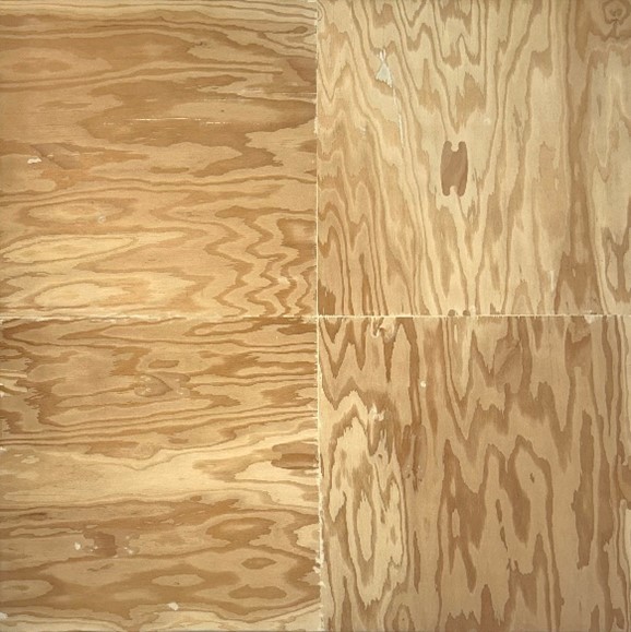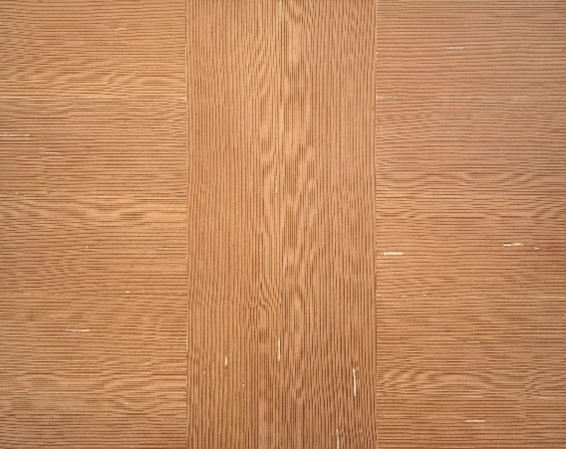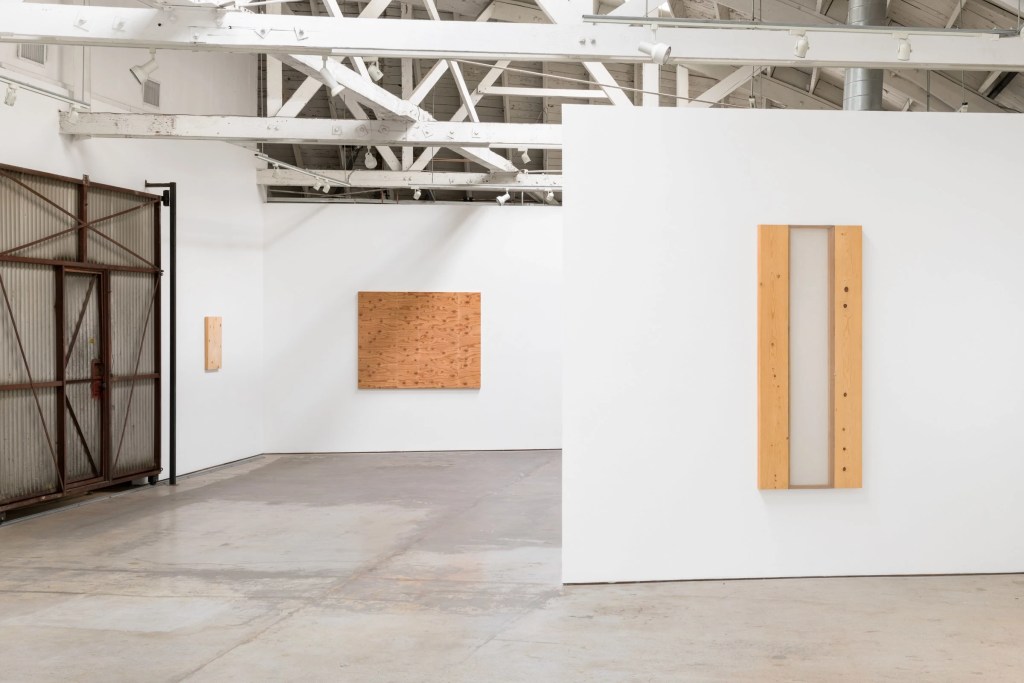 The “Lumber” works are as plainspoken as they are slyly humorous. They trade in arrangements of humble forms of wood from Home Depot and construction-grade fir plywood or pine planks, most of them transformed into landscapes that utilize – indeed celebrate – their flaws, including abstract arrangements of knots and plugs that could read as fields of eyes. The plywood might loosely evoke Sherrie Levine, who in her “knot paintings” emphasized the machined knots by painting or gold-leafing them.