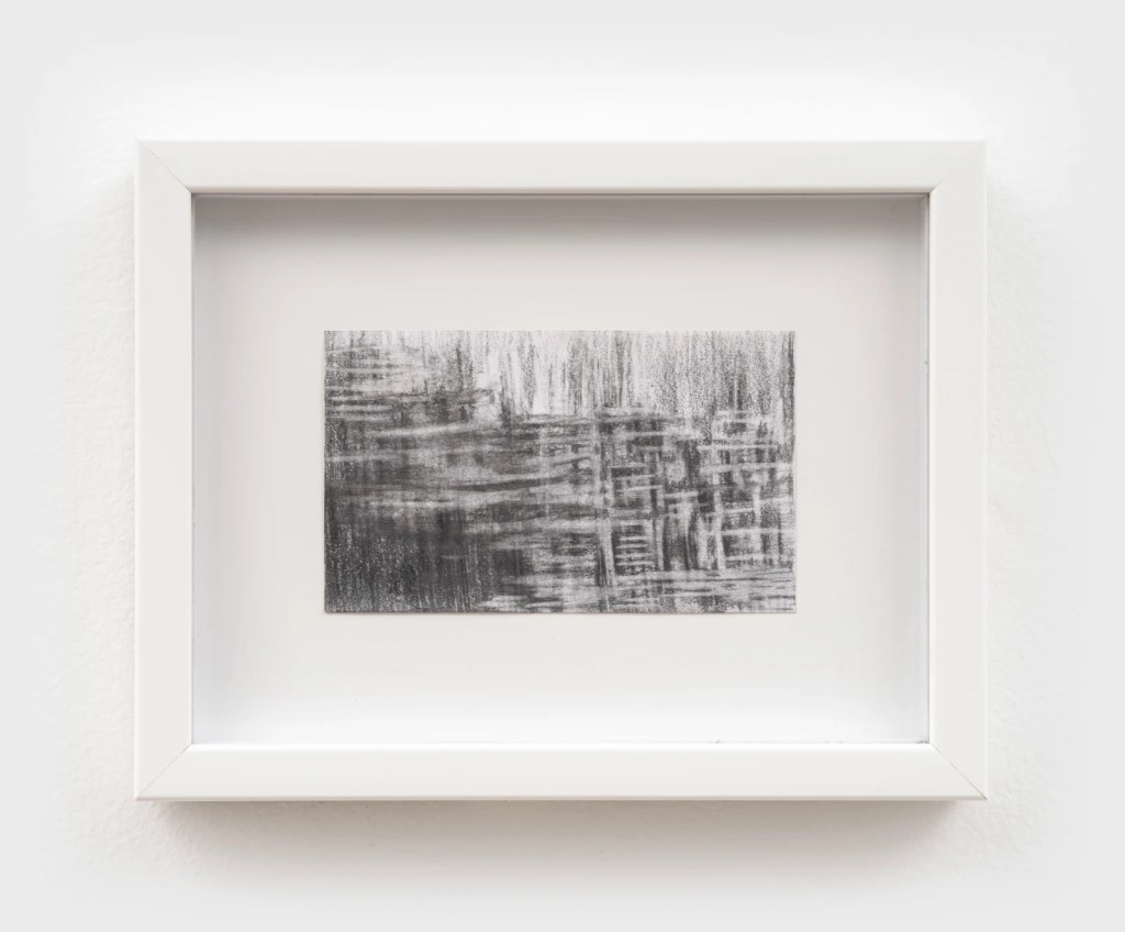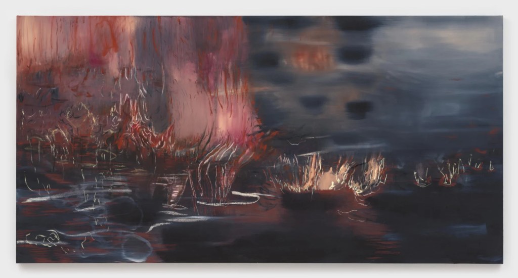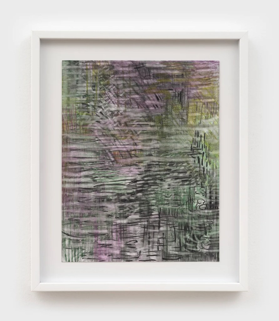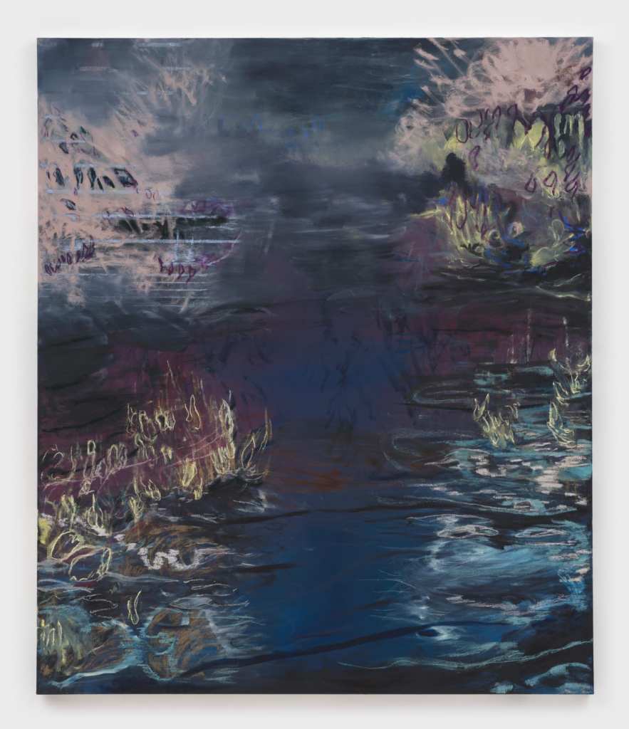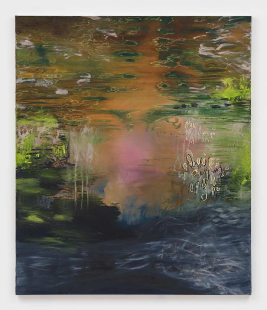 She has effectively transferred the surface of the marsh onto the canvas, using layers of oil paint to simulate the texture of water and lines of oil pastel to depict the rising wet fog and the sunlight spreading across the water’s surface. Multilayered colors and intense brushstrokes blur the boundaries between air and water, creating mirages. The paintings do not depict a hierarchical world but rather a flattened plane on which all perceptible elements are perpetually interacting.