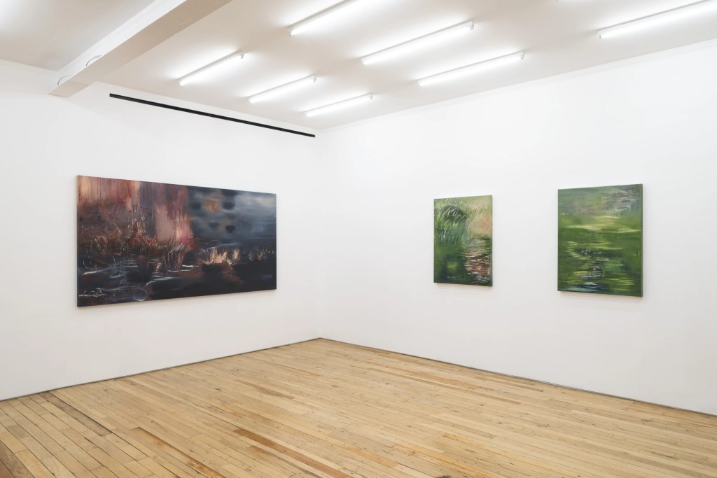 Contributed by Kun Kyung Sok / “Pouring Water Into Water,” Sarah Martin-Nuss’s first solo exhibition at the Rachel Uffner Gallery, comprises paintings and drawings that immerse viewers in fluid abstract landscapes inspired by marshes she remembers from her youth on Texas’s Gulf Coast. The paintings initially suggest serene swamps, their surfaces reflecting the sky and surrounding features. Deeper scrutiny uncovers two worlds closer by – one above the water paced by reeds swaying in a wet mist, and another below it teeming with aquatic creatures shimmering in the sunlight.