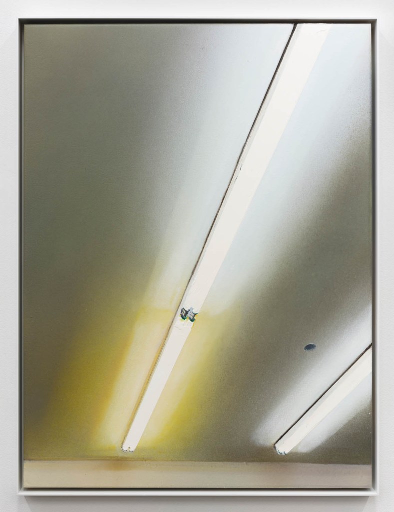 Nearby is another representation of artificial light, this one an oil painting of fluorescent bulbs. Unlike the downward-facing desk lamp with its concentrated light, the bulbs radiate outward across a gray ceiling. From the other side of the room, the image is instantly recognizable, but in close, where the bulbs fit into their sockets, the representation breaks down. Here Blair has painted in an impressionistic manner, reducing pins and sockets to dashes and splotches of paint. He is a master of rendering, but what intrigues me most is how and where he chooses to abstract the image. It is a pleasant revelation to see how this point of connection, where bulb meets socket, is also where representation collapses into beautiful abstraction.