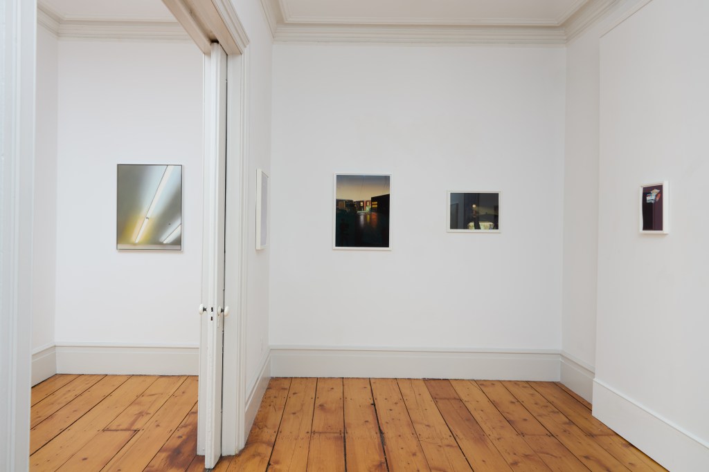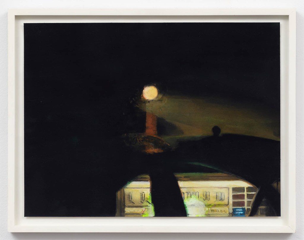 An untitled painting of a nocturnal scene is the most bewildering of the show. At its center, a circular light beams towards us. It’s unclear whether it is a moon hanging low in the sky, a street lantern, or maybe even a lighthouse. Whatever it is, the mysterious night light cuts through the surrounding fog, scanning the scene like a sentinel. In the foreground is the silhouette of a car and through it perhaps a parking garage, glowing in that special way buildings do after-hours. I was most curious about a lime-green reflection across the car’s window. I didn’t know if it came from outside the car or was created by Blair’s camera flash. The stain was visually harmonized within the picture, but also hard to identify, evoking my own memories of feeling out of place.
