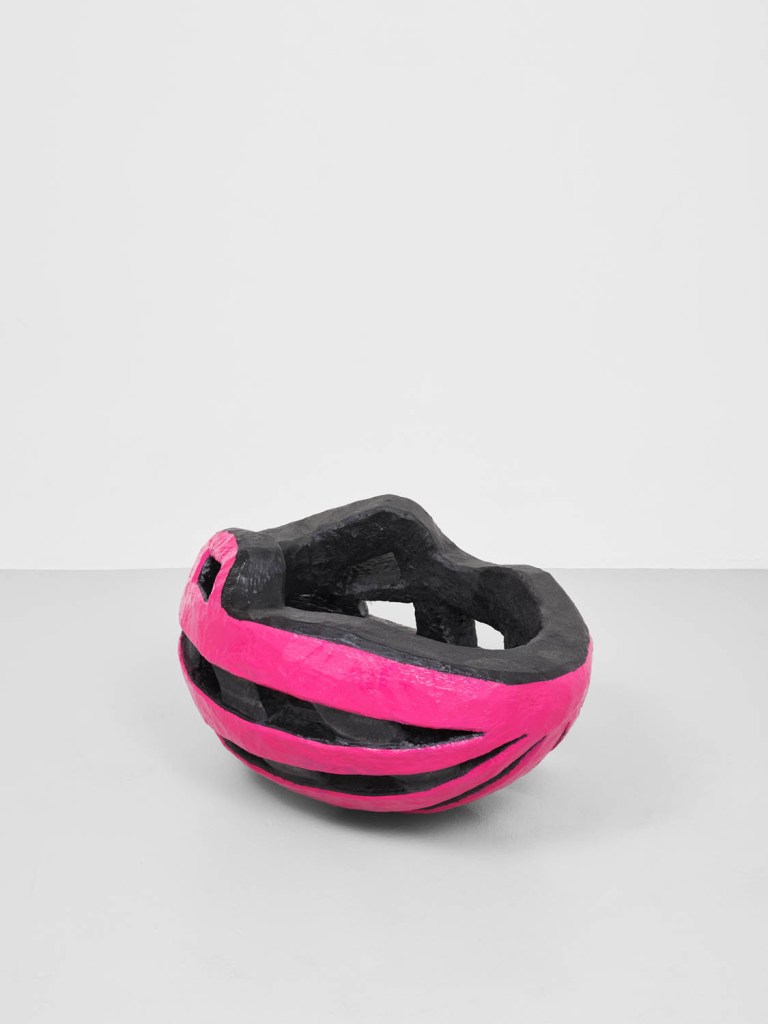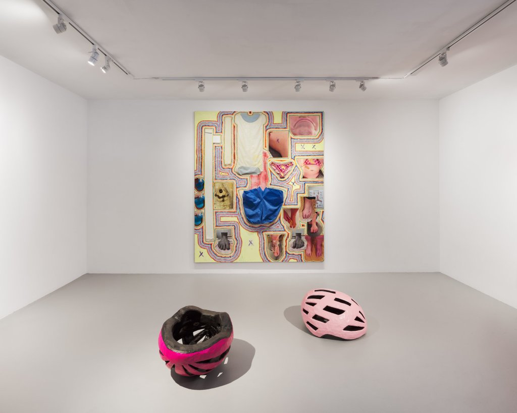 Exam Shorts, Blue Large is more collage than painting. But strips of paint improbably knit its disparate elements into a cohesive whole. This gives the piece a diagrammatic feel not unlike a public transit map. Garments zig-zag up the surface. starting with the titular blue exam shorts hanging upside down. Above and slightly to the right is a pair of tie-dyed underwear, right side up. It sits between a tubular bag made of thick, flexible plastic and a photograph of someone wearing the underwear, upside down. (This upside-down/right-side-up motif is repeated throughout the show, notably in Accident 1 and Accident 2, two oversized helmets that live on the floor.) Images proliferate on the surfaces – a hole in a tree stuffed with pinecones, a mysterious blue drink in triplicate on the left border — but feet pics dominate. About eight of feet in various states of healing and trauma populate the lower right quadrant. Carefully chosen and evidently autobiographical, the cluster of images – a bandaged foot, a purple leg next to a normally colored one, a hospital poster of a leg – tell a nonlinear story about healing and care. Especially compelling is the depiction of someone washing a wound as yellow suds accumulate around the brush and hand. At the top of the canvas is a person’s frowning face, establishing that what they’re going through sucks. It’s touching, hilarious, and utterly relatable.