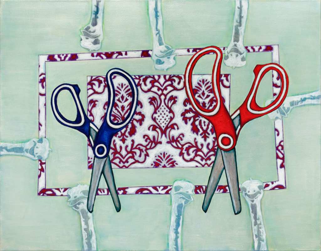 Matthes calls attention to his work’s constructed nature, collecting various visual fragments that don’t always connect, illuminating the fogginess of recall. To like effect, he uses different applications for different collaged elements. Some are painted in thin, sheer layers, others in thick strokes or blobs of choppy paint. Still others are a mix of the two, emphasizing distinct and incongruous subjects sharing finite space. Matthes, Sandbox, Cutthroat captures this dynamic by way of two huge pairs of children’s scissors – one red, one blue – encircled by the decapitated heads of ostriches arranged around the perimeter.